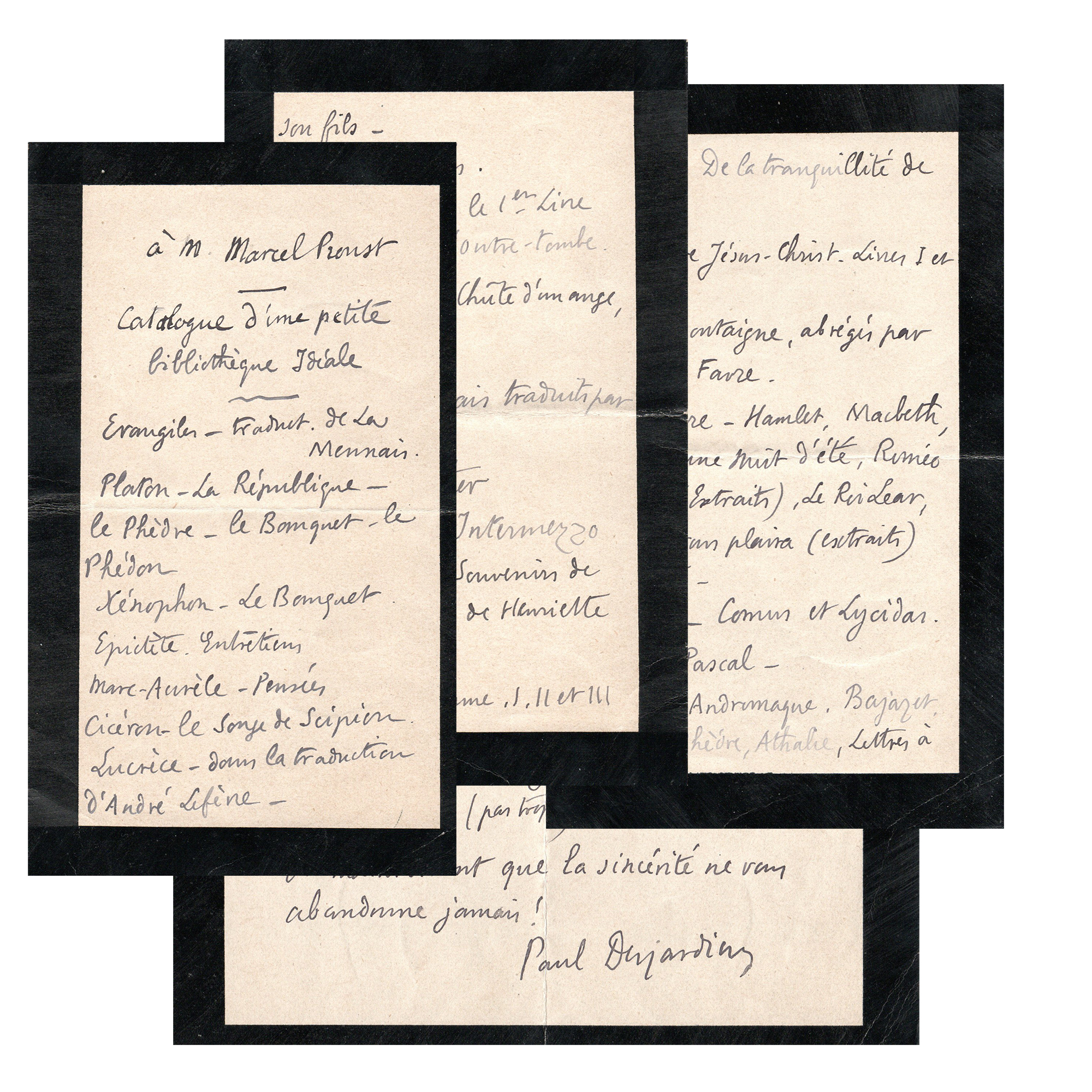 " Paul Desjardins, dont le frère est un condisciple de Proust à Condorcet, a envoyé au jeune Proust au milieu des années 1890 ce catalogue pour une petite bibliothèque idéale.