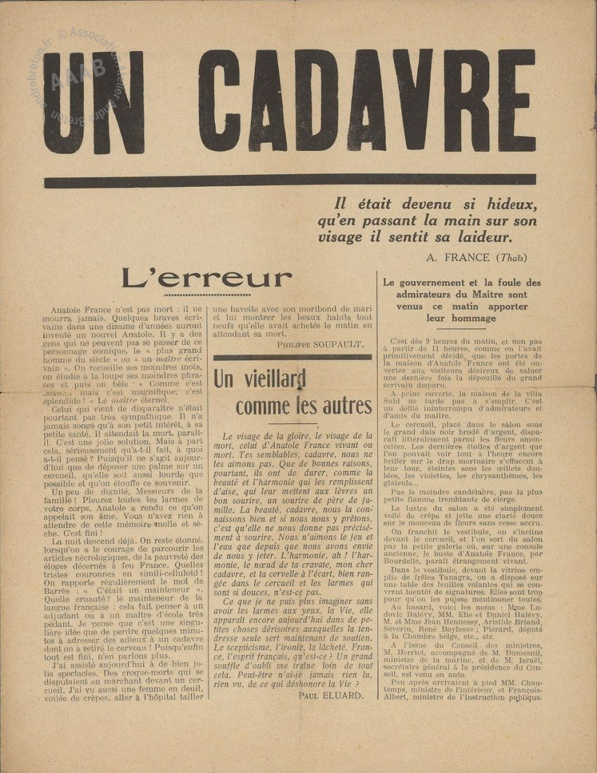 GM - Anatole France ne s’est jamais relevé de l’attentat des surréalistes, le tract Un cadavre, d’une violence inouïe, qui l’a placé sur les « listes noires » des auteurs à proscrire dont parle Milan Kundera dans Une rencontre.