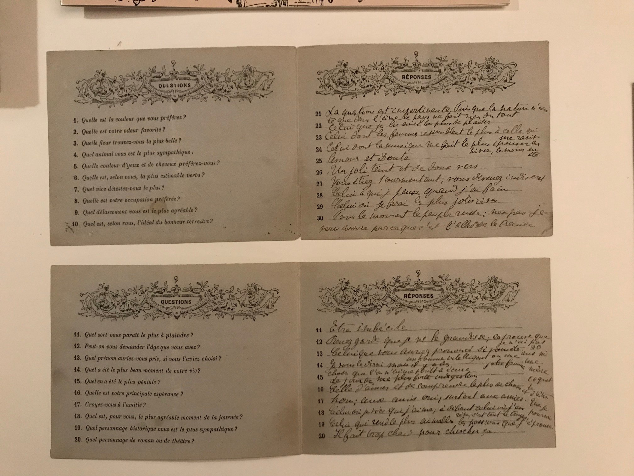 Jürgen Ritte, Vice-président et cofondateur de la Société Marcel Proust allemande, la « Marcel Proust Gesellschaft », a fait un premier pas en traduisant le questionnaire en allemand. Cette version a été présentée une première fois sous forme de dialogue lors de la traditionnelle Matinée de proustiens allemands, le 1er juillet passé. Et un deuxième pas sera fait en novembre prochain, le 18 pour être précis, date de l’inauguration d’une exposition importante organisé dans les murs de la Biblioteca Proustiana Reiner Speck, à Cologne. On y présentera de nombreux documents, livres, lettres et manuscrits illustrant l’histoire et la conception de ce jeu de société qui nous est venu d’Angleterre, et on mettra l’accent, bien entendu sur ce troisième questionnaire (dans l’ordre de la découverte) qui est sans doute le premier que Proust a renseigné.