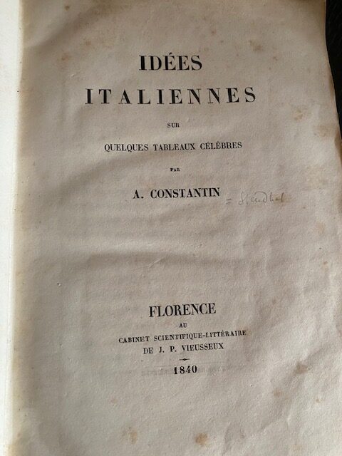 Ce livre de 1840, dont l’Hôtel Littéraire Stendhal possède l’édition originale grandes marges, avec une eau forte frontispice représentant la Porte Settimnia dans le Trastevere, et dans une reliure italienne d’époque en parchemin, a été écrit en grande partie par Stendhal et publié sous le nom de l'un de ses amis, Abraham Constantin.