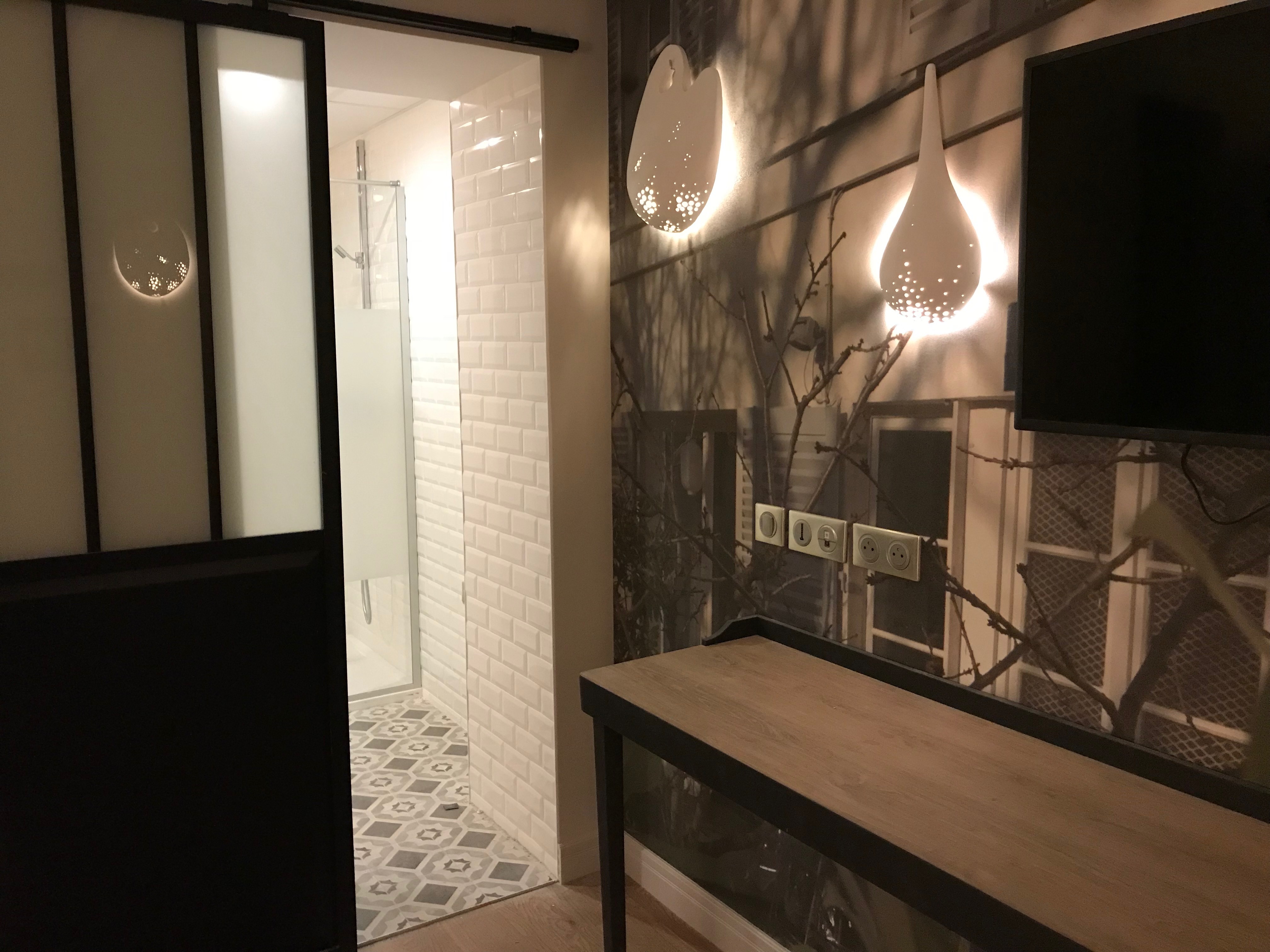 Alors que Le Swann et Le Gustave Flaubert sont tout en longueur, l’hôtel Marcel Aymé est tout en verticalité, pareil à un perchoir d’où l’on domine tout Paris, pareil à une tour de Babel au sein de laquelle chaque étage aurait son propre langage, riche d’un univers propre. Ma chambre, celle qui a pour nom « Antoine Blondin », Hussard qui promettait qu’ « un jour, nous prendrons des trains qui partent », est une des plus belles de l’hôtel, et de ma fenêtre je peux voir tout Paris, où le ciel en ces jours gris offre un contraste magnifique avec les poutres claires. Mais, particularité intéressante, et encore si rare à Paris, l’hôtel propose aussi de véritables appartements, au sein desquels séjourner en famille. Pourquoi ne m’y rejoindrais-tu pas ?
