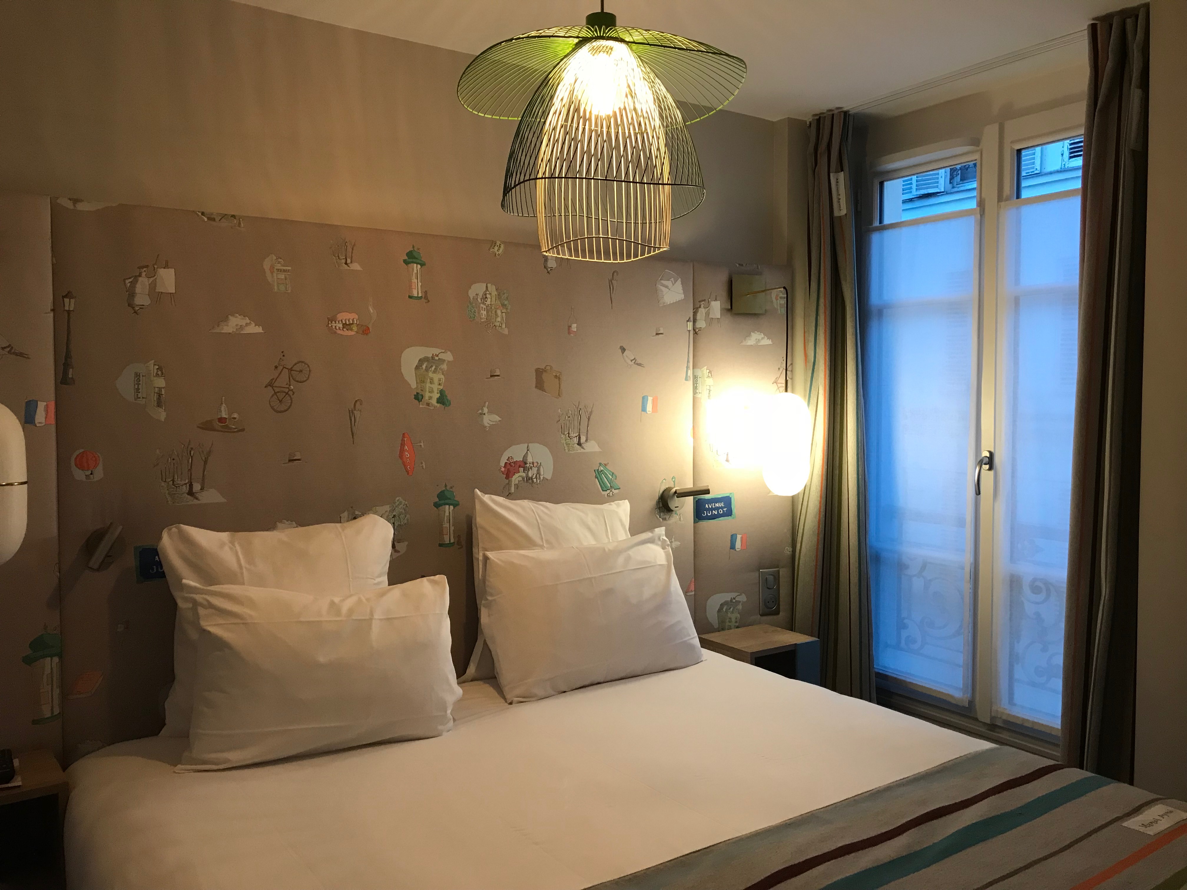 Comme les autres Hôtels Littéraires, Marcel Aymé est organisé d’une façon bien spécifique, et chaque étage est, là encore, une véritable invitation au voyage. A peine arrivé dans l’hôtel, tu es accueilli par un superbe comptoir blanc, sur lequel le nom « Marcel Aymé » se détache dans une élégante typographie. Tu trouveras dans ce hall plusieurs rayonnages de bibliothèques, au sein desquels retrouver l’œuvre de Marcel Aymé, mais aussi des essais, et des œuvres de ses amis. Au rez-de-chaussée se trouvent ces fameux appartements, comme L’Atelier de Grandgil, mais aussi la salle du petit-déjeuner, où par touches facétieuses l’univers du franc-comtois se rappelle à nous. L’escalier rend ainsi hommage à deux des sœurs les plus célèbres de la littérature, Delphine et Marinette, et l’on trouve dans l’encadrement d’une fenêtre une sculpture de Marcel Aymé, que tu peux même voir de la rue. Toutes les chambres du rez-de-chaussée sont d’ailleurs consacrées à Montmartre. Ne manque surtout pas la chambre Le Passe-Muraille et l’incipit de cette nouvelle reproduite dans le hall. C’est lui, ce Dutilleul, aussi connu sous le nom de Garou Garou, qui passe à travers les murs ! Savais-tu d’ailleurs qu’une statue de ce passe-muraille, réalisée par Jean Marais, se trouve place Marcel Aymé non loin de l’hôtel ! C’est une étape incontournable à toute odyssée montmartroise !