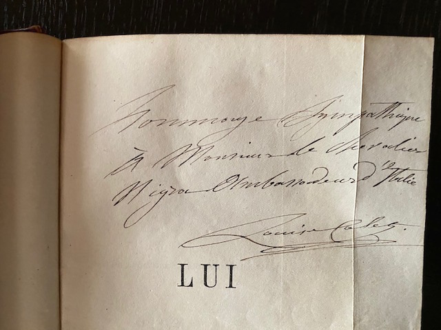 Ce deuxième envoi est adressé au chevalier Costantino Nigra (1828-1907), poète et homme politique italien alors en poste à Paris en qualité d'ambassadeur. Cette adresse figure en tête du roman Lui, publié en 1859 chez Michel Lévy.Louise Colet fut pendant six mois la maîtresse d'Alfred de Musset, comme sa consœur George Sand avant elle pendant plus de deux ans. Après la mort du poète, celle-ci évoqua leur liaison tumultueuse dans un roman intitulé Elle et Lui auquel répondit maladroitement Paul de Musset dans Lui et Elle. Louise Colet décida d'intervenir dans la bataille et mit en scène à travers des personnages à peine déguisés, les protagonistes déjà cités : Musset, Sand et elle-même. Mais surtout, elle en profita pour régler ses comptes avec un autre ancien amant : Gustave Flaubert, plus de quatre ans après leur rupture.