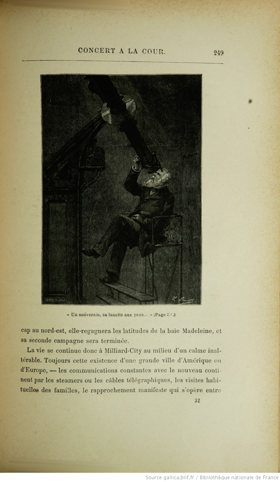 Quoi qu’il en soit, les instruments d’optique occupent dans les Voyages extraordinaires une place éminente. Et nous sommes nombreux à regretter de ne pas pouvoir revoir le fabuleux Château des Carpathes réalisé par Jean- Christophe Averty (1976), qui avait si bien exploité cette fascination. Au reste, les deux célèbres caméos que nous possédons de Verne nous rappellent l’intérêt que l’écrivain leur portait, le premier est dans Vingt mille lieues sous les mers, et le second plus intéressant pour notre propos est dans l’Ile à hélice. Dans l’ensemble du cycle, l’usage des télescopes y est sinon fréquent, en tout cas évidemment promu à des péripéties notoires : Maston chute dans le tube du télescope de Long’s Peak, Thomas Black n’a pu observer l’éclipse qu’il attendait depuis si longtemps à cause de la dérive du glaçon dans le Pays des fourrures. Il existe donc déjà avec Verne un type d’astronomes malchanceux victimes des Caprices d’un astre.
