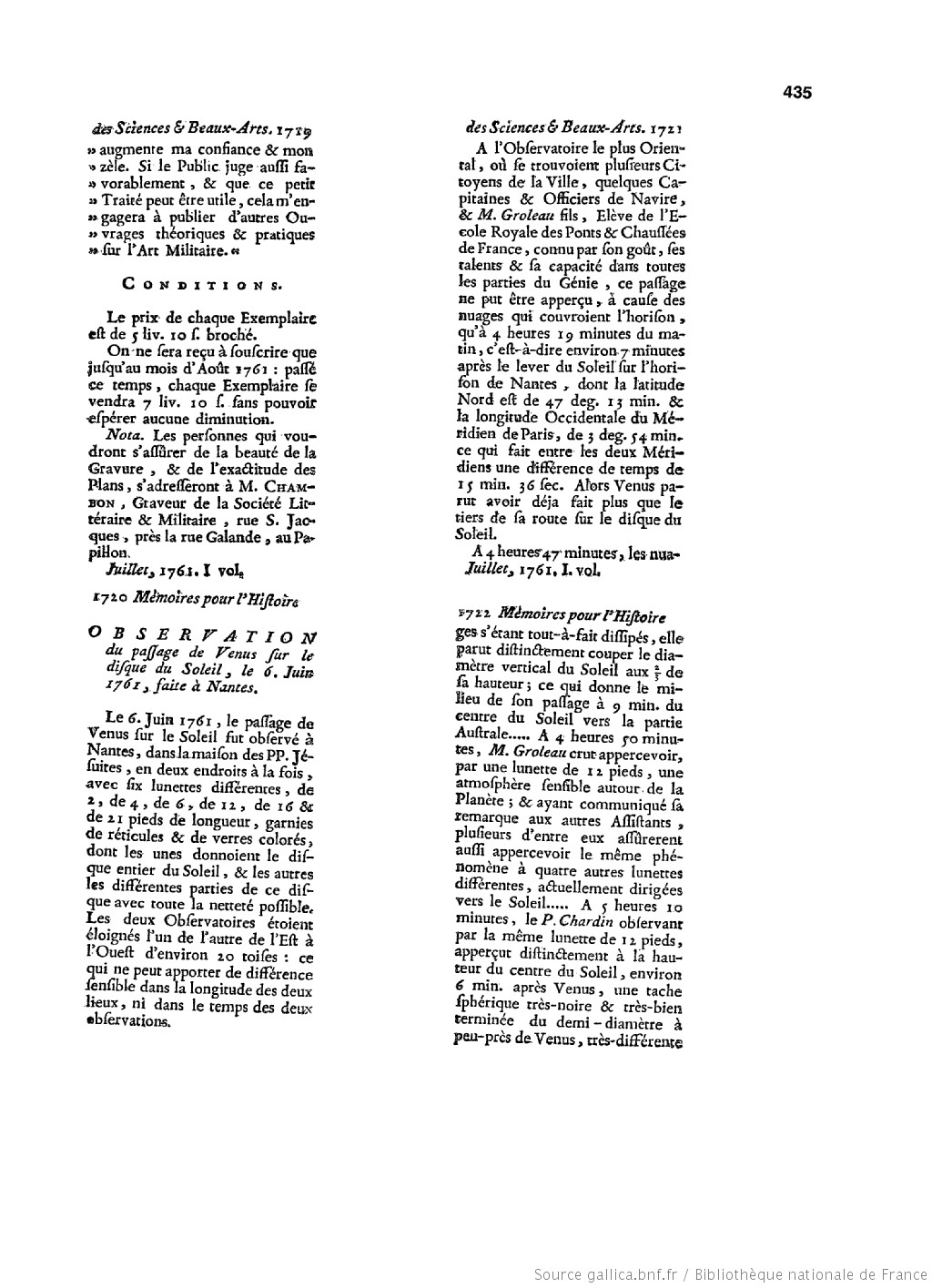Le 6 juin 1761, Nantes, à l’Hôtel de Briord, qui est la Maison des Jésuites depuis 1671, les bon pères guettent avec impatience le passage de Vénus sur le disque du soleil, dès 4 h du matin. Le Père Chardin qui dirige l’École d’Hydroraphie a mobilisé ce qui tient lieu de presse locale à l’époque et des observateurs férus de sciences, tous l’oeil fixé sur 6 lunettes de tailles différentes (elle vont de 2 pieds à 21 pieds), elles sont munies de réticules protecteurs, disposées sur deux endroits du jardin, séparés de 20 toises. Le temps est couvert quand le soleil se lève, lorsque l’horizon se découvre 7 minutes plus tard la planète a parcouru un tiers de son tajet sur le disque du soleil.L’observation se terminera à 8 h 30 et toutes les précisions seront données par le Père Chardin dans les Annonces, affiches, nouvelles et avis divers sur la ville de Nantes, en date du 17 juin 1761. Peu de temps après elles seront reprises dans Les Mémoires de Trévoux (Juillet 1761, I, p. 1719-1725) qui avaient le don de faire bâiller, puis d’empoisonner le fameux jésuite Berthier de Voltaire. Chassés en 1762, les jésuites ne pourront procéder à Nantes à une nouvelle observation du transit de Vénus quelques années plus tard (en 1769).