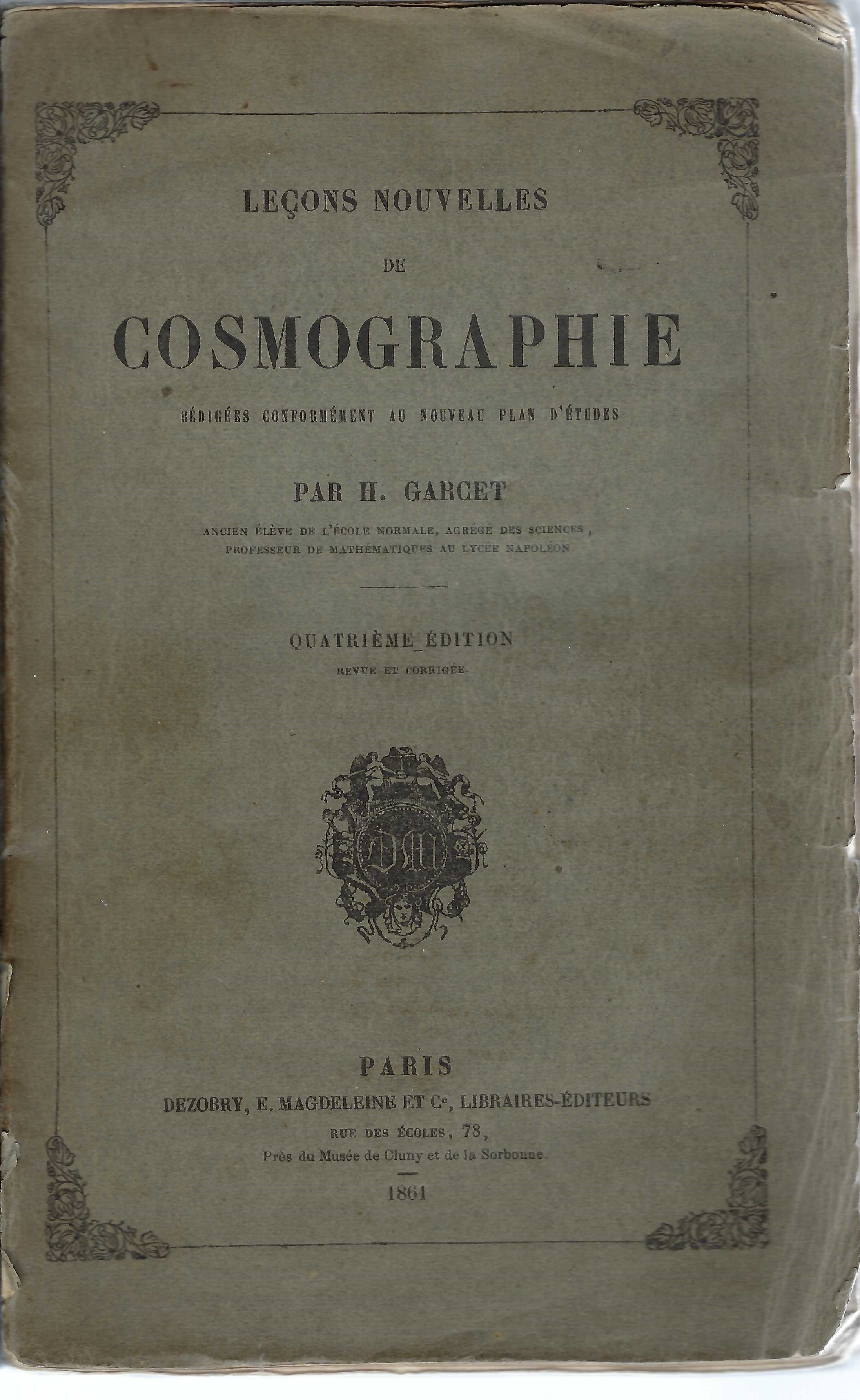 1853 : Henri Garcet, agrégé des sciences, professeur de mathématiques au Lycée Napoléon – l’actuel Lycée Henri IV - (il y prépare au concours de Polytechnique) fait paraître ses Leçons nouvelles de Cosmographie, à Paris, où il consacre plusieurs pages à la planète Vénus et à ses passages devant le disque du soleil. Il y évoque les phénomènes de 1761 et 1768, et surtout explique comment cette observation permet de calculer la distance de la terre au soleil. Or, Henri Garcet est le cousin germain de Verne, qui est parisien alors. Le futur écrivain achète ce livre qui lui sera très précieux au temps du cycle du Gun-Club qui débute en 1865 avec De la terre à la lune. Mais il le cite dans une longue note du chapitre 8 des Aventures de trois Russes et de trois Anglais, pour expliquer comme on procède pour obtenir des triangulations géodésiques.