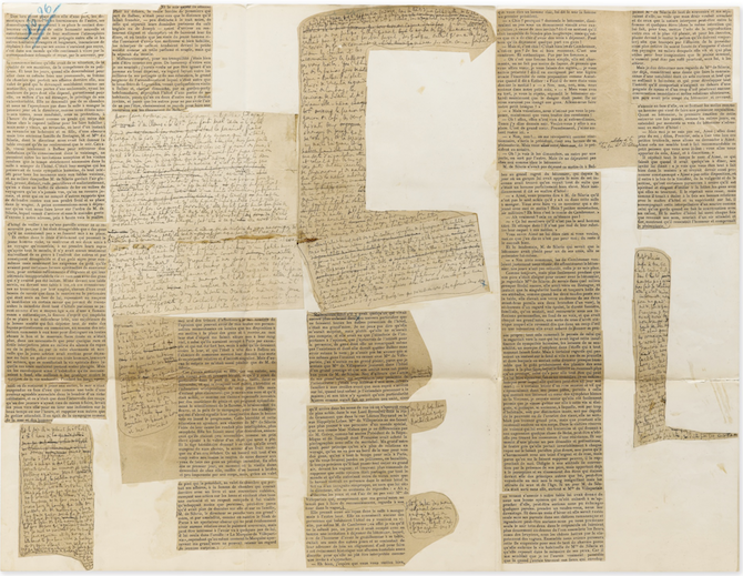 SHL. Rappelons que vous êtes, entre mille autres choses, le directeur général délégué du Musée du quai Branly. J’ai eu la chance d’entendre, dans la chambre de Marcel Proust du Grand Hôtel de Cabourg, une de vos conférences sur Proust, Turner et Ruskin. Votre Dictionnaire Proust-Ruskin (Classiques Garnier, 2017), était-ce l’occasion rêvée de parler d’une autre de vos passions, l’art, et plus spécialement la peinture ? JR. "Difficile de parler de Proust et de Ruskin sans parler de peinture, en effet, et ce n’est pas la moindre motivation quand on s’intéresse aux relations entre les deux écrivains. Quant à l’Art, qu’il s’agisse de musique, de peinture ou de littérature, que puis-je dire qui ne soit pas banal pour définir la place qu’il occupe dans ma vie ?"Placard inédit de A l'ombre des Jeunes filles en fleurs, corrigé de la main de Proust, acquis par la SAMP.