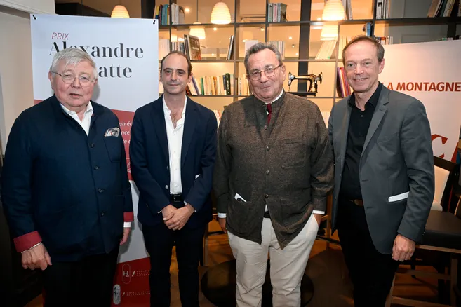 De gauche à droite : Jacques Letertre, président de la Société des Hôtels Littéraires. David Ducreux, secrétaire général du prix Vialatte. Jérôme Leroy, lauréat 2025. Olivier Bonnichon, directeur de la communication de La Montagne groupe Centre-France. © Rémi DUGNE