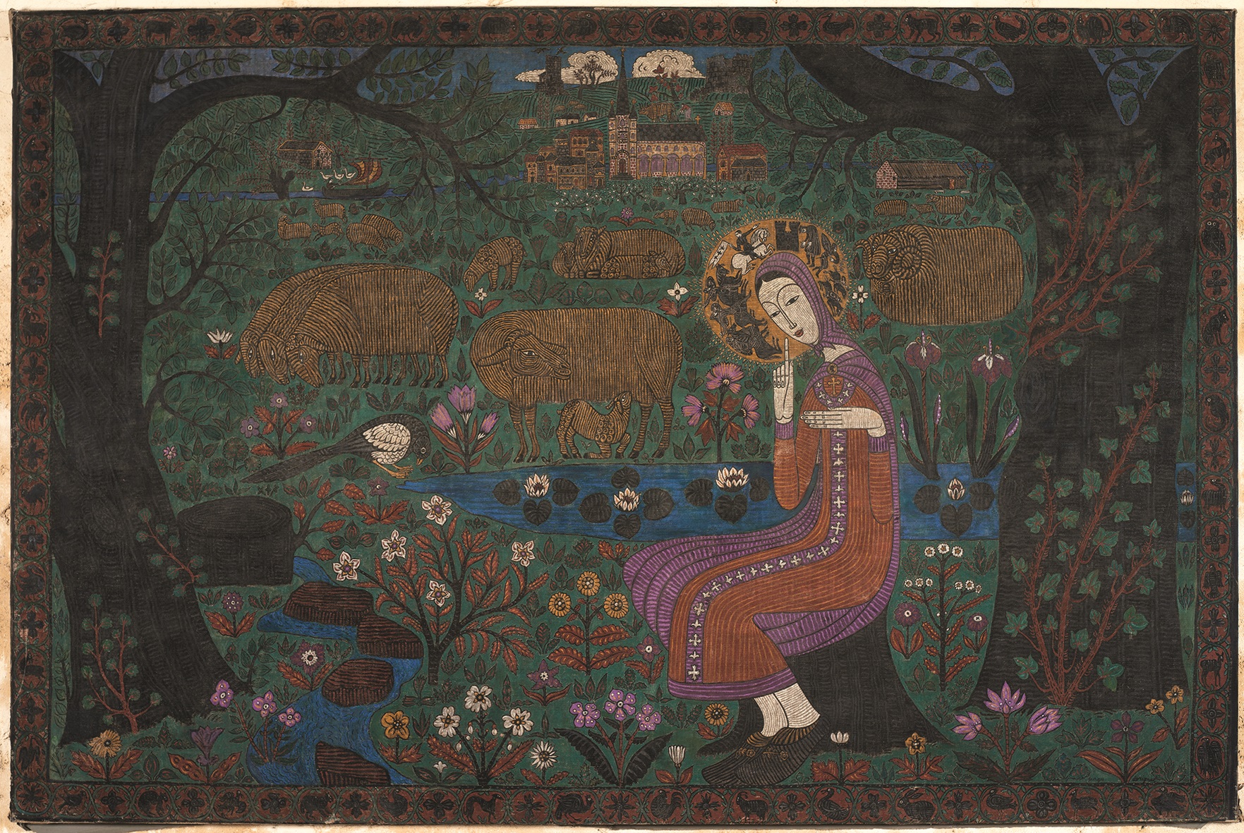 Familier depuis sa jeunesse du musée Guimet, Dorignac se plaît aussi à bâtir un univers imaginaire orientalisant et à même de refléter l’universalité du sentiment religieux. Dans la toile “Mandala”, travail préparatoire pour une mosaïque ou une tapisserie, les quatre divinités représentées au centre incarnent les quatre fleuves du paradis de la Genèse, ou encore aux les quatre continents. Tout autour du cercle, les religions sont figurées par leurs différents symboles : étoile de David, croix, bouddha, croissant et vache sacrée. Aux yeux d’Armand Dayot (1851-1934), historien de l’art et inspecteur général des Beaux-Arts, c’est “le rêve du bonheur” de l’artiste qui prend forme ici. Dorignac ne lui avait-il pas un jour confié : “Certes oui j’aimerais bien représenter les choses de mon temps, que de belles œuvres décoratives à exécuter d’après la vie de nos provinces de France, et tout particulièrement de mes provinces basques ! Mais pour cela, il faudrait me déplacer et ma pauvreté m’attache à mon taudis et m’oblige à vivre du trésor de mes rêves.”