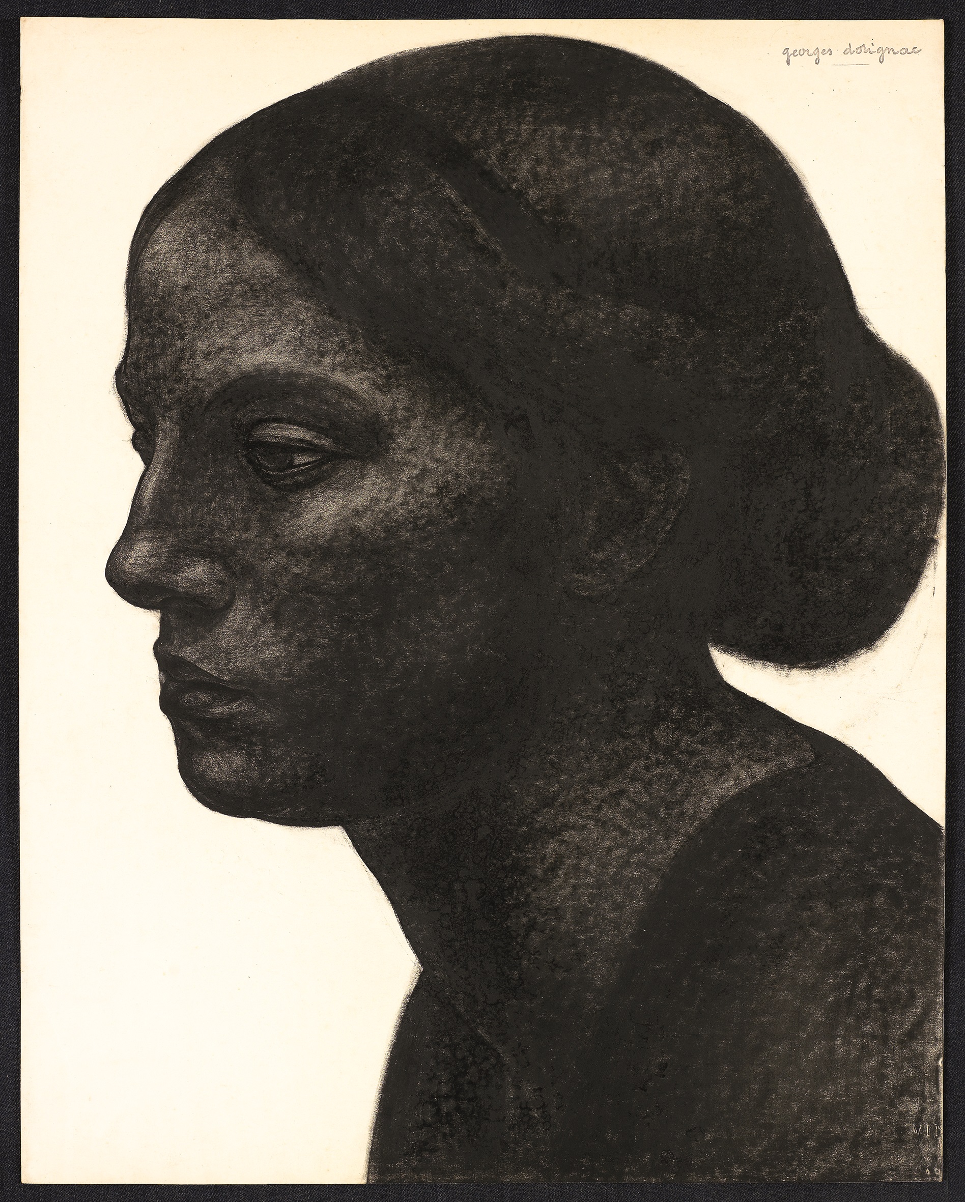 En perpétuelle recherche, Dorignac ne tarde pas ainsi à se réinventer lui-même et dans l’atmosphère d’émulation qui règne à La Ruche inaugure en 1912, sa période noire peuplée désormais de visages et de nus d’ébène. L’exposition du musée de Montmartre offre ainsi au regard plus de 50 œuvres, fusains, sanguines, et lavis correspondant à cette période de création du peintre. Sur fond blanc, se détachent désormais des visages que ne traversent plus la lumière mais qui au contraire réfractent cette dernière à la manière de portraits sculptés. A travers le noir, et ses infimes variations de gris, c’est la plénitude même de la matière qui est ainsi restituée. Graves et puissants, visages et corps, révélés par leur masse, habitent la toile avec une sourde intensité. Dans les Salons où Dorignac expose, cette expressivité dure et singulière ne manque pas de frapper les esprits. Guillaume Apollinaire reconnaît en lui “un artiste savant”, qui “peint des ombres chinoises”. Auguste Rodin, qui exerça lui-même une grande influence sur Dorignac, est fasciné par sa capacité “à sculpter ses dessins”.