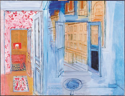 À partir de 1911, Dufy se fixe à Montmartre avec son épouse Eugénie-Émilienne Brisson, dans l’atelier du 5 impasse Guelma, qui restera jusqu’à la fin de sa vie son point d’attache à Paris. Cette adresse, à la fois espace intime et de rencontre, et surtout haut lieu de création, inspire à l’artiste des œuvres majeures, pendant les quatre décennies qui suivent. Nombreuses sont celles présentées dans l’exposition à l’exemple des différents Nus dans l’atelier, couvrant la période 1930-1944, 30 ans ou la vie en rose peint en 1931 ou encore en 1952 la Nature morte au violon intitulée aussi Hommage à Bach. L’atelier de l’impasse Guelma donne aussi son nom, entre 1935 et 1952 à trois tableaux notoires dont la version appartenant aux collections du Musée National d’Art Moderne, fait partie de l’accrochage. On y reconnaît les murs de la pièce où il travaillait du bleu vif dont il les avait recouverts, faisant ainsi de son atelier, véritable laboratoire artistique, le reflet à la fois tangible et symbolique de sa peinture. Celle-ci en effet est marquée à partir de 1919 par l’affirmation d’un style nouveau caractérisé par la dissociation du dessin et de la couleur, la fluidité du pinceau et l’omniprésence du bleu “seule couleur” à ses yeux “qui à tous ses degrés, conserve sa propre individualité”.