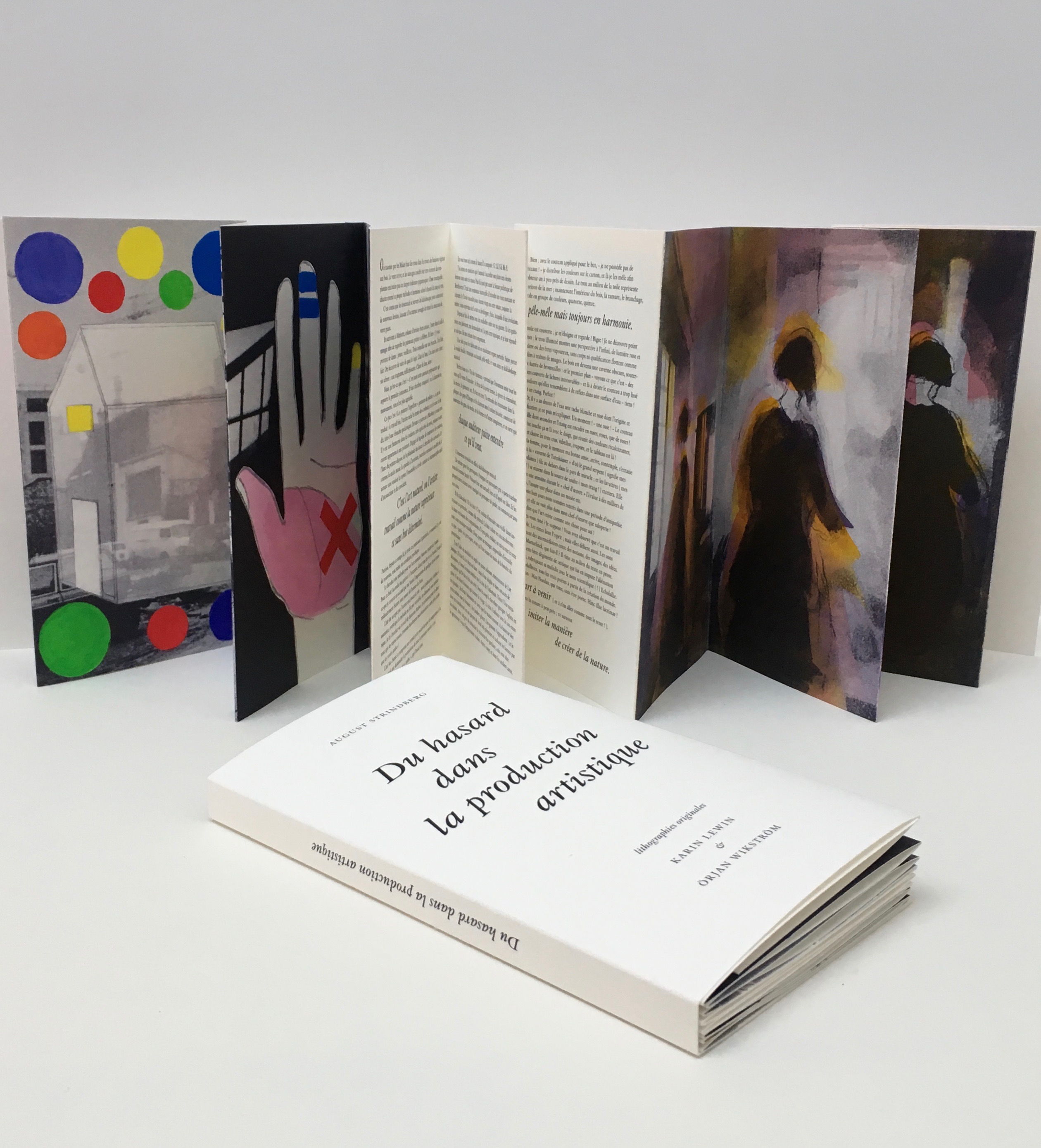 Une théorie qui a inspiré Karin Lewin et Örjan Wikström, deux artistes suédois vivant et travaillant en France depuis les années 1970. Pour mettre en œuvre leur désir de livre d’artiste, ces derniers ont fait appel à Annika Baudry, graphiste et relieure également d’origine suédoise. Chef d’orchestre du présent ouvrage, elle a placé les réflexions de Strindberg au cœur d’un leporello. Elles sont encadrées par les lithographies en gris foncé, rehaussées de couleurs à la main, d’après les œuvres de Karin Lewin – photographies de Paris prises en 1976 et 1977 – et d’Örjan Wikström – peintures acryliques représentant des femmes vues de dos dans un intérieur.