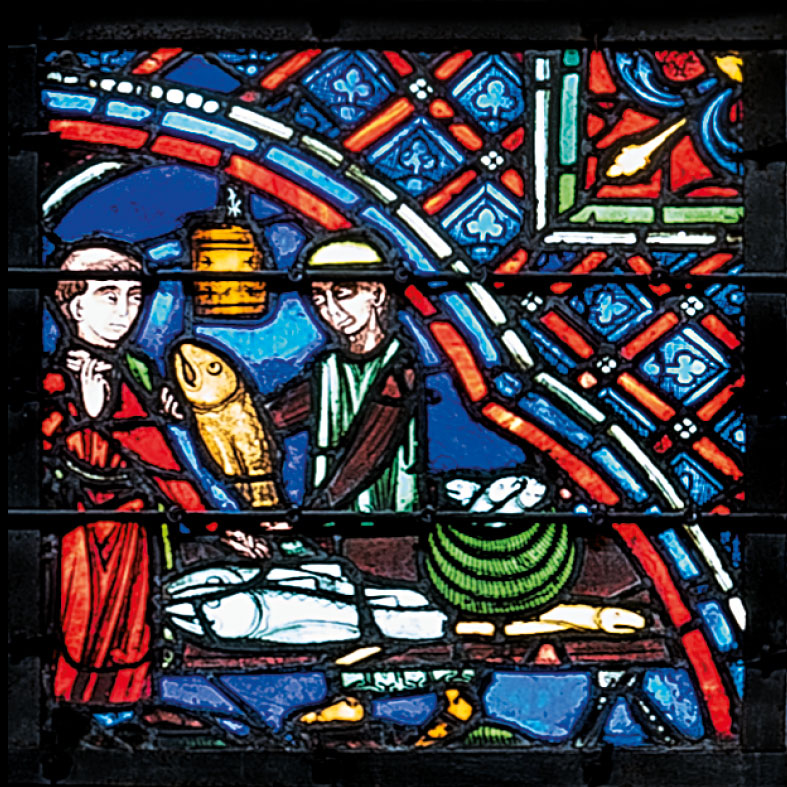 JL - À quel moment retrouvons-nous le vitrail de saint Julien lors de la visite de la cathédrale dans Madame Bovary ?YL — Ce vitrail est l’une des principales attractions de la cathédrale, signalée dans le livre de Langlois. Il fallait donc qu’il ait une place lors de cette visite. Flaubert aurait pu choisir de le faire présenter par le Suisse. Mais la légende se termine sans doute trop bien, par l’ascension du double parricide devenu un saint, pour qu’elle entre dans le discours sinistre du guide. Alors, Flaubert a préféré l’introduire de biais, par une allusion qui passe inaperçue à la plupart des lecteurs. En attendant Emma, qui tarde à venir, Léon regarde au hasard autour de lui : « ses yeux rencontrèrent un vitrage bleu où l’on voit des bateliers qui portent des corbeilles. Il le regarda longtemps, attentivement, et il comptait les écailles de poissons et les boutonnières des pourpoints ». Il ne peut s’agir que du vitrail de saint Julien, que Flaubert ne nomme pas parce qu’il se place au point de vue de son personnage ignorant ce que la scène représente : au bas du vitrail figurent en effet les donateurs, qui ne sont pas des bateliers, mais des pêcheurs, vendant leurs poissons. Grâce aux photographies d’aujourd’hui prises au téléobjectif, on voit en effet les écailles des poissons, mais il est impossible de les discerner à l’œil nu quand on est au pied du vitrail. Tout se passe comme si Léon hallucinait ces détails hyperréalistes, de même que les boutonnières des pourpoints, qui n’existent pas : les poissonniers portent des tuniques sans ouverture.