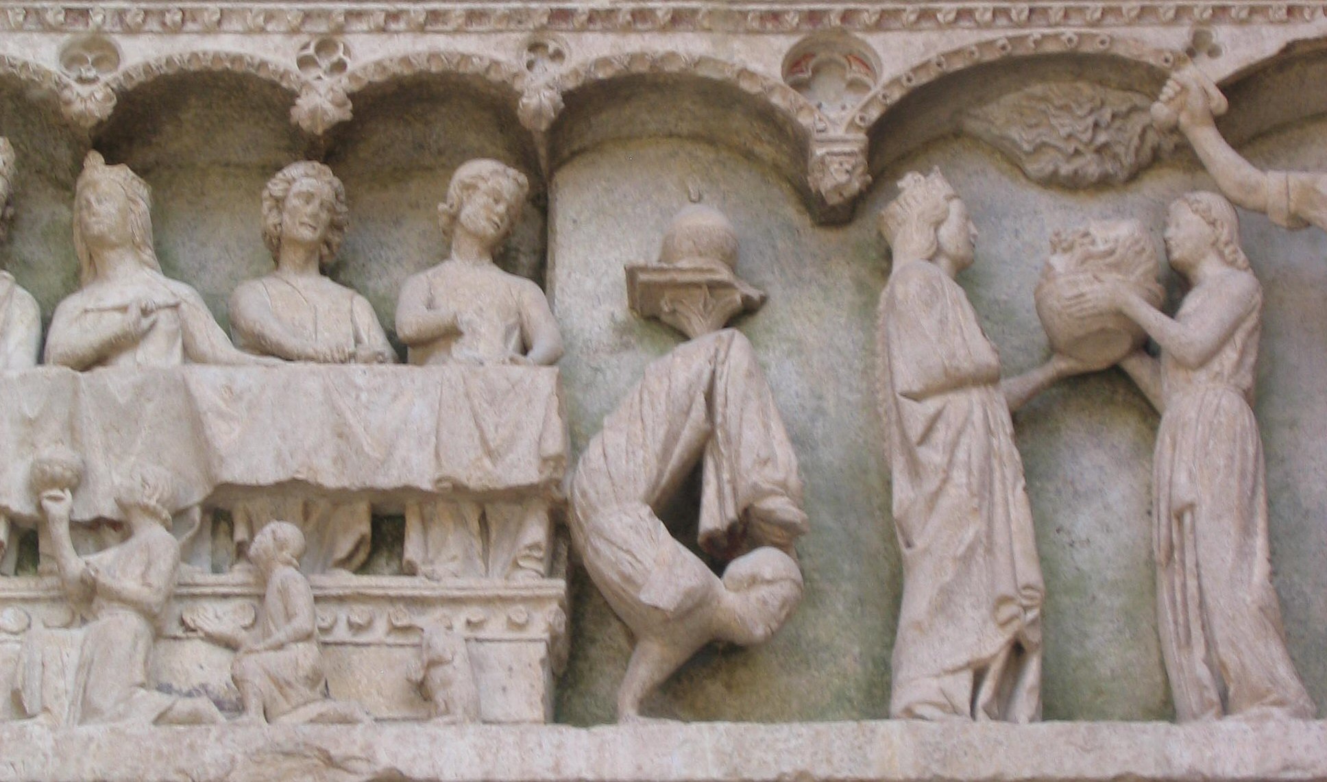 YL — Pour le dernier conte de son recueil, dans l’ordre de la lecture, Flaubert part du récit biblique qu’on trouve dans les Évangiles selon Matthieu (14.1) et selon Marc (6.14). C’est un très bon connaisseur de la Bible, dont il possédait plusieurs traductions. L’histoire de la décollation de Jean-Baptiste a retenu son attention par le mélange d’éros et de thanatos : le gouverneur de Galilée, Hérode, a épousé la veuve de son frère, Hérodias. Jean-Baptiste dénonce publiquement cette union, interdite par la loi juive. L’autorité le fait enfermer, mais depuis sa prison, il continue à proférer des anathèmes contre le couple. Comment le faire taire ? Hérode le ménage par peur, mais Hérodiade est bien décidée à l’éliminer. L’occasion se présente au moment de l’anniversaire d’Hérode. Il donne un festin à ses invités. Hérodias profite de ce moment pour faire danser sa fille Salomé. Elle séduit Hérode qui lui promet de lui donner tout ce qu’elle lui demandera : sa mère lui souffle d’exiger la tête de Jean-Baptiste. Ce drame entre dans le thème commun aux Trois contes : la sainteté et son envers, ici la luxure et le meurtre. La petite Salomé, inconsciente de ses pouvoirs de jeune fille, deviendra la figure de la femme fatale (après Freud, on dirait la femme castratrice) qui fascinera les artistes symbolistes et décadents. Le tympan du portail saint Jean, à gauche de la façade, raconte l’histoire sous la forme d’une véritable bande dessinée de pierre, en plaçant au centre la danse de Salomé, à gauche la table du festin et à droite les deux scènes qui concernent Jean-Baptiste : à l’extrême droite, sa tête dépasse d’une fenêtre de la prison ; devant lui, un soldat lève son épée. À gauche de cette scène, Salomé offre à sa mère la tête de Jean-Baptiste, posée sur un plateau. En théorie, Flaubert n’avait donc pas besoin de regarder ce tympan pour écrire le conte ; la source livresque lui suffisait. Mais un détail dans la description de la danse de Salomé, apparemment gratuit, retient l’attention : « Sa nuque et ses vertèbres faisaient un angle droit. » La Bible parle uniquement de la danse, sans autre précision. La tradition iconographique représente Salomé en train d’exécuter la danse des sept voiles. Or Flaubert représente la jeune fille dansant sur les mains, comme les saltimbanques (les injures du temps l’ont privée d’un bras), et le cou plié à quatre-vingt-dix degrés : c’est précisément la position acrobatique de la Salomé de pierre. La géométrie de l’angle droit vient du tympan, comme si le cou « cassé » de la danseuse faisait écho à la décollation de Jean-Baptiste.