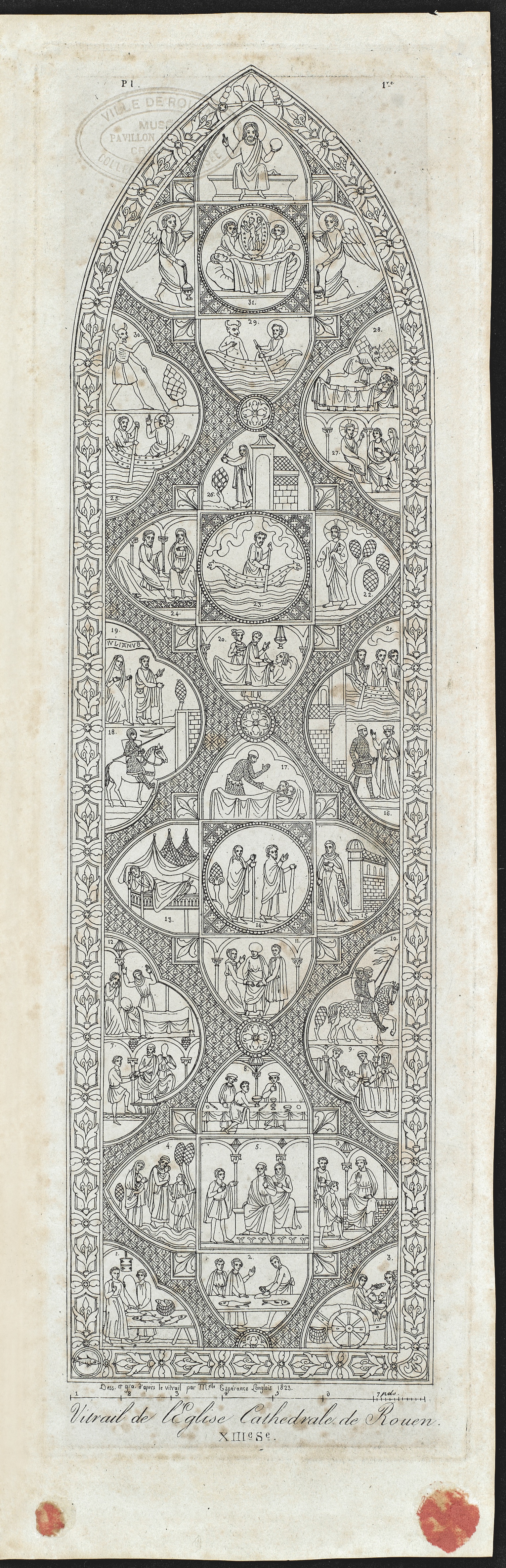 YL — Eustache-Hyacinthe Langlois, dessinateur, graveur et essayiste, était un ami de la famille Flaubert. Il a eu une influence certaine sur les écrits du jeune Gustave, comme l’ont montré Guy Pessiot et Joëlle Robert dans les Cahiers Flaubert Maupassant n° 37, 2019. Guy Pessiot a exposé sa collection personnelle de gravures et de livres de Langlois à l’Hôtel littéraire Flaubert en octobre 2022. Flaubert connaissait l’ouvrage de Langlois, l’Essai historique et descriptif sur la peinture sur verre ancienne et moderne et sur les vitraux les plus remarquables, publié en 1832. L’exemplaire qui appartenait à son père se trouve toujours actuellement dans la bibliothèque conservé à Canteleu. Langlois décrit précisément le vitrail de saint Julien, en reconstituant les épisodes du récit découpé dans les compartiments du vitrail. Ces explications sur le papier sont précieuses car le vitrail monte si haut sous la nef qu’il est difficile de bien comprendre son organisation quand on le regarde sur place. Pour rendre ses explications claires, Langlois a inséré dans son livre, sous forme d’encart en trois volets dépliant verticalement, un dessin du vitrail sur lequel chaque médaillon porte un numéro, avec un renvoi dans le texte. Ce dessin a été gravé par la fille d’Eustache-Hyacinthe Langlois, Espérance. Pour une édition séparée de son conte, promise par son éditeur, Flaubert aurait souhaité reproduire ce vitrail en le coloriant, non pas pour illustrer son texte (car il opposait les deux régimes de signes, iconiques et textuels) mais au contraire pour dérouter le lecteur : « En comparant l’image au texte on se serait dit : “Je n’y comprends rien. Comment a-t-il tiré ceci de cela ?” » (lettre à Georges Charpentier, 16 février 1879). Outre l’incompatibilité de nature, selon Flaubert, entre ce qu’on voit et ce qu’on lit, le vitrail et le conte présentent des différences importantes dans les éléments du récit : la verrière ne comporte aucune scène de chasse, alors que cette activité est déterminante dans La Légende écrite, et l’épouse de Julien l’accompagne dans son ermitage, après le meurtre de ses parents : pour Flaubert, le paria et futur saint, figure de l’artiste, ne peut être que solitaire.