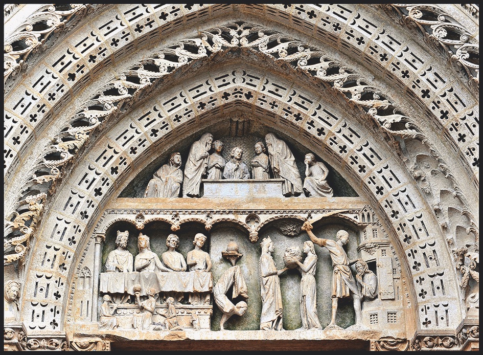 JL - Comment le tympan du portail saint Jean consacré au martyre de saint Jean-Baptiste a servi de source d’inspiration pour un des Trois contes, Hérodias ?Sculpture gothique en pierre, tympan du portail saint Jean de la façade Ouest, début XIIIe siècle : au registre supérieur le "Mystérieux Passage" de saint Jean l'Evangéliste; au registe inférieur scène du martyre de saint Jean Baptiste
