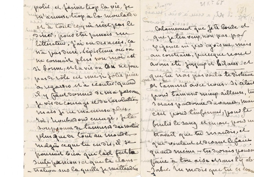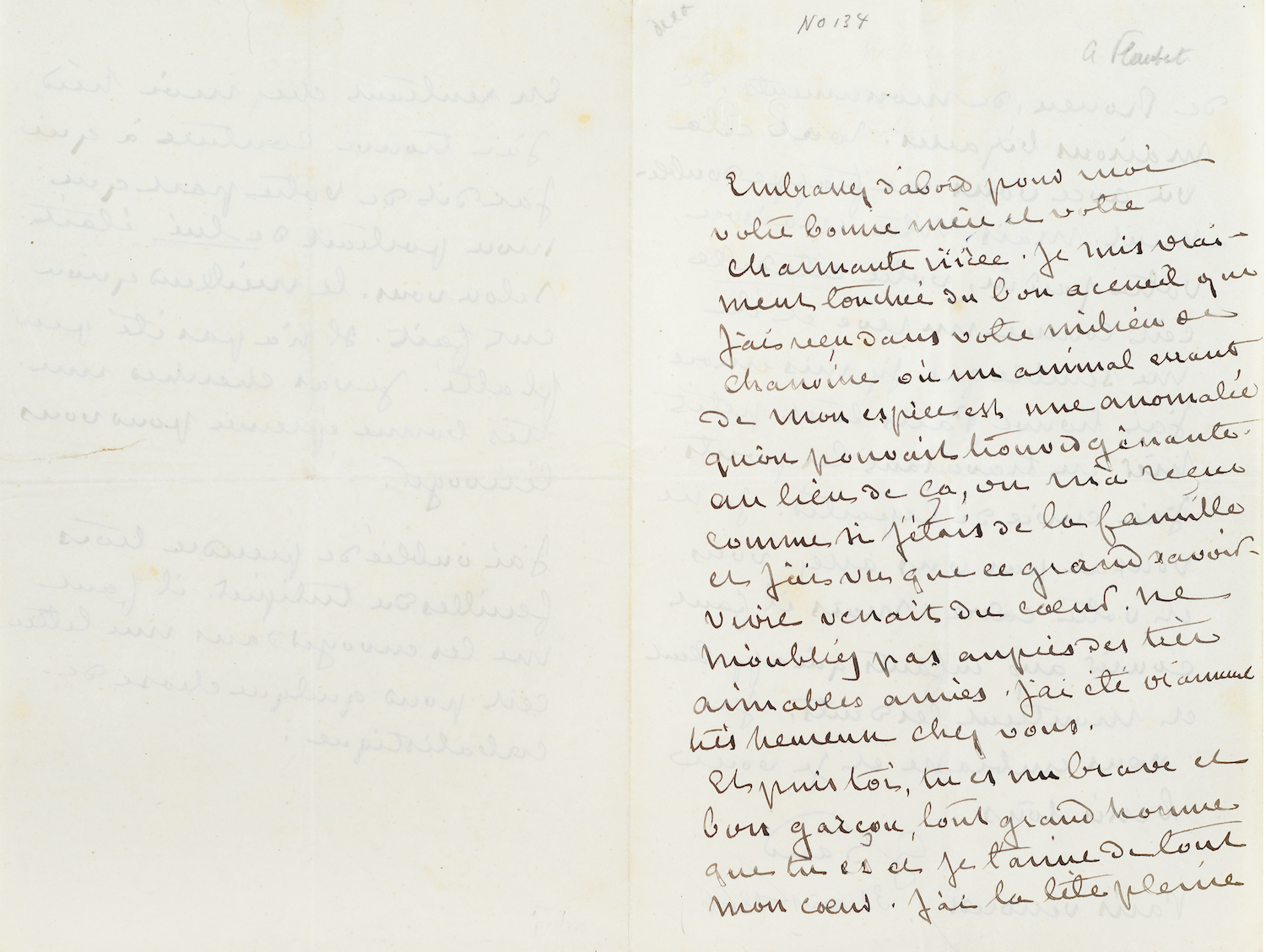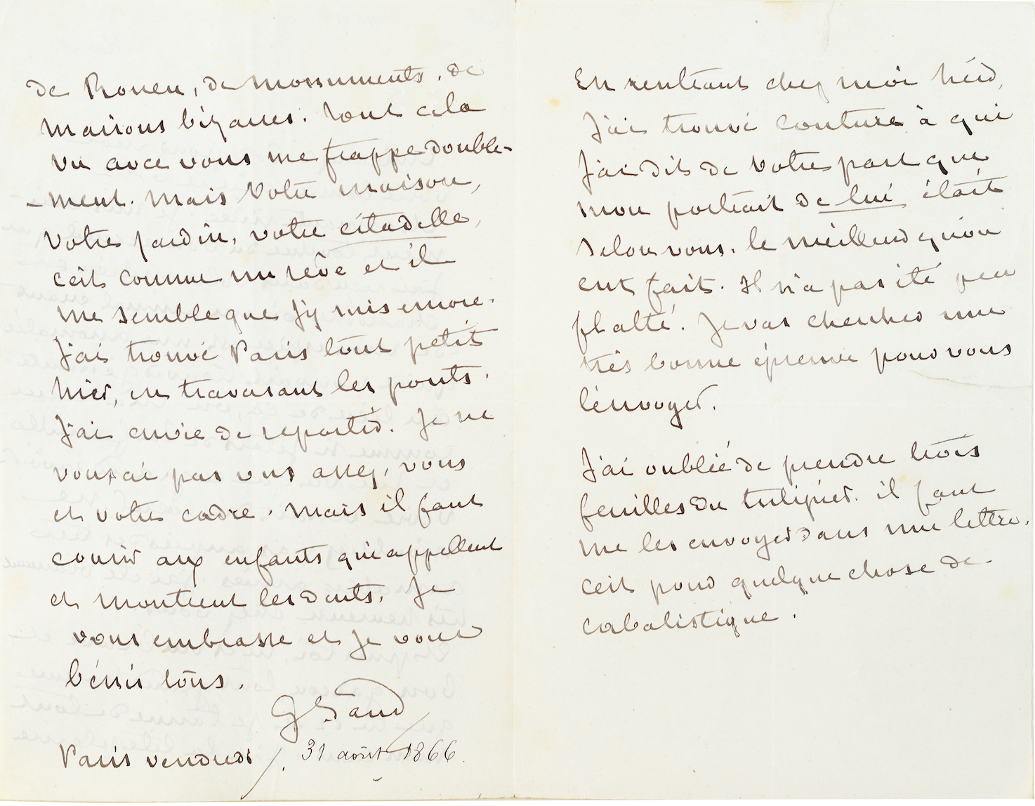 Voici quatre exemples de lettres écrites par George Sand à son « vieil ami », de dix-sept ans son cadet. Ces manuscrits appartiennent à la collection de Jacques Letertre, président de la Société des Hôtels Littéraires. Ces lettres sont exposées en compagnie d'autres manuscrits – livres, notes de travail et lettres – et de précieuses éditions originales à l'Hôtel Littéraire Gustave Flaubert à Rouen – en attendant l'ouverture d'un futur Hôtel Littéraire George Sand...