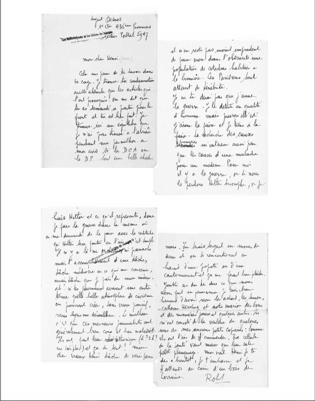 Cela me peine de te savoir dans ta cage. Je trouve ta condamnation aussi absurde que les articles qui l’ont provoquée. On me dit que tu as demandé à partir pour le front et tu as bien fait. Je trouve ici un équilibre que je n’ai pas trouvé à l’arrière pendant ma permission. à mon avis si la DCA ou la D.P. sont une belle chose il n’en reste pas moins imprudent de faire vivre dans l’obscurité une population de citadins habitués à la lumière. Les Parisiens sont atteint de ténébrite.