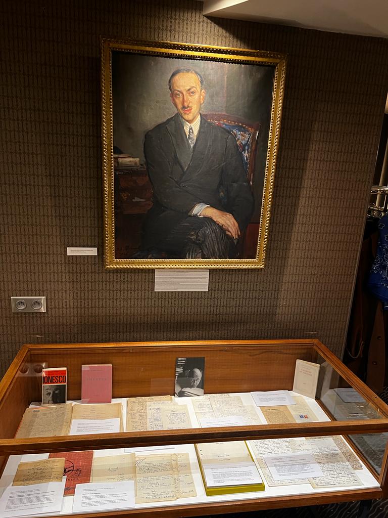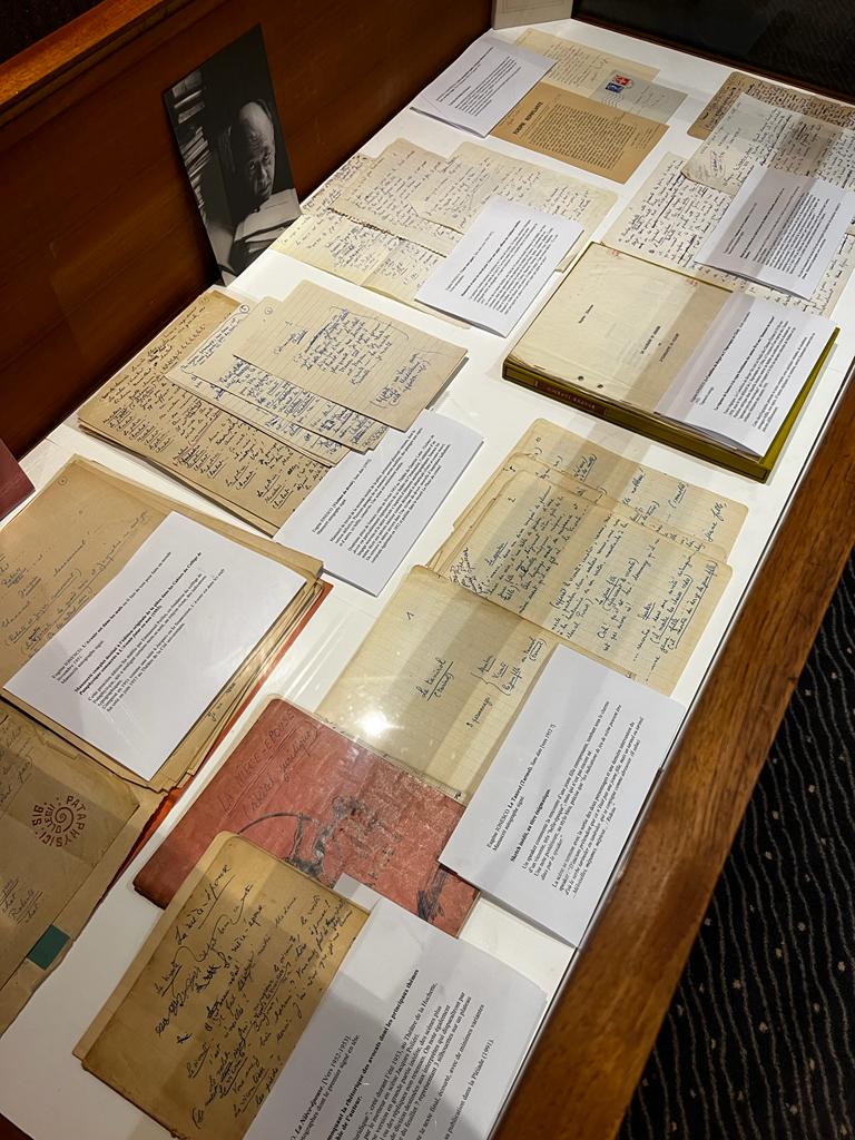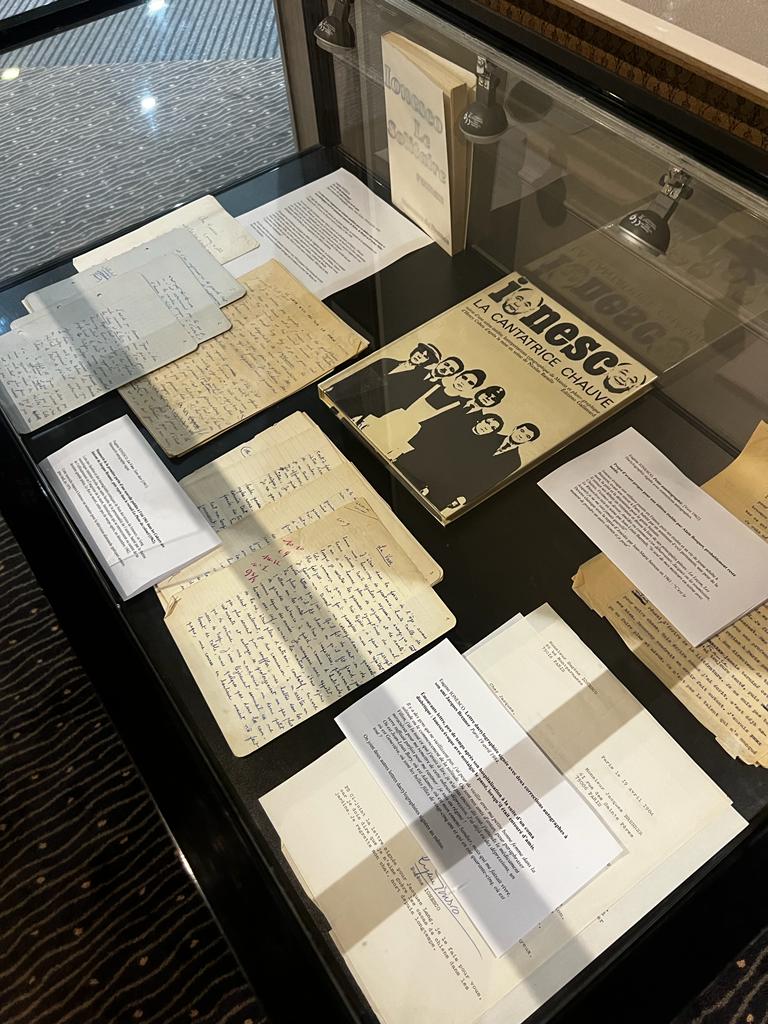 À l'occasion du dévoilement du nouveau timbre d'Eugène Ionesco, qui s'est déroulé à l'Hôtel Littéraire Le Swann le 31 janvier 2024, en partenariat avec La Poste, une exposition de manuscrits rares de l'écrivain a été organisée dans l'hôtel par Benoît Forgeot, expert en livres anciens et modernes.