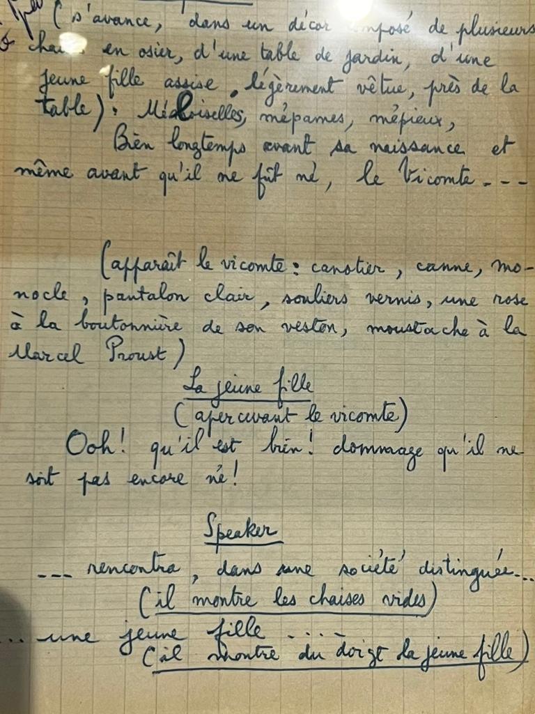 Dans son mot d’introduction, Jacques Letertre a ainsi relevé le passage du sketch Le Tanirol, dans lequel l’un des trois personnages, le vicomte, est ainsi décrit par Ionesco : “canotier, canne, monocle, pantalon clair, souliers vernis, une rose à la boutonnière de son veston, moustache à la Marcel Proust.” Le clin d’œil était très drôle – et nous avons mis en évidence dans la vitrine le passage en question du manuscrit.