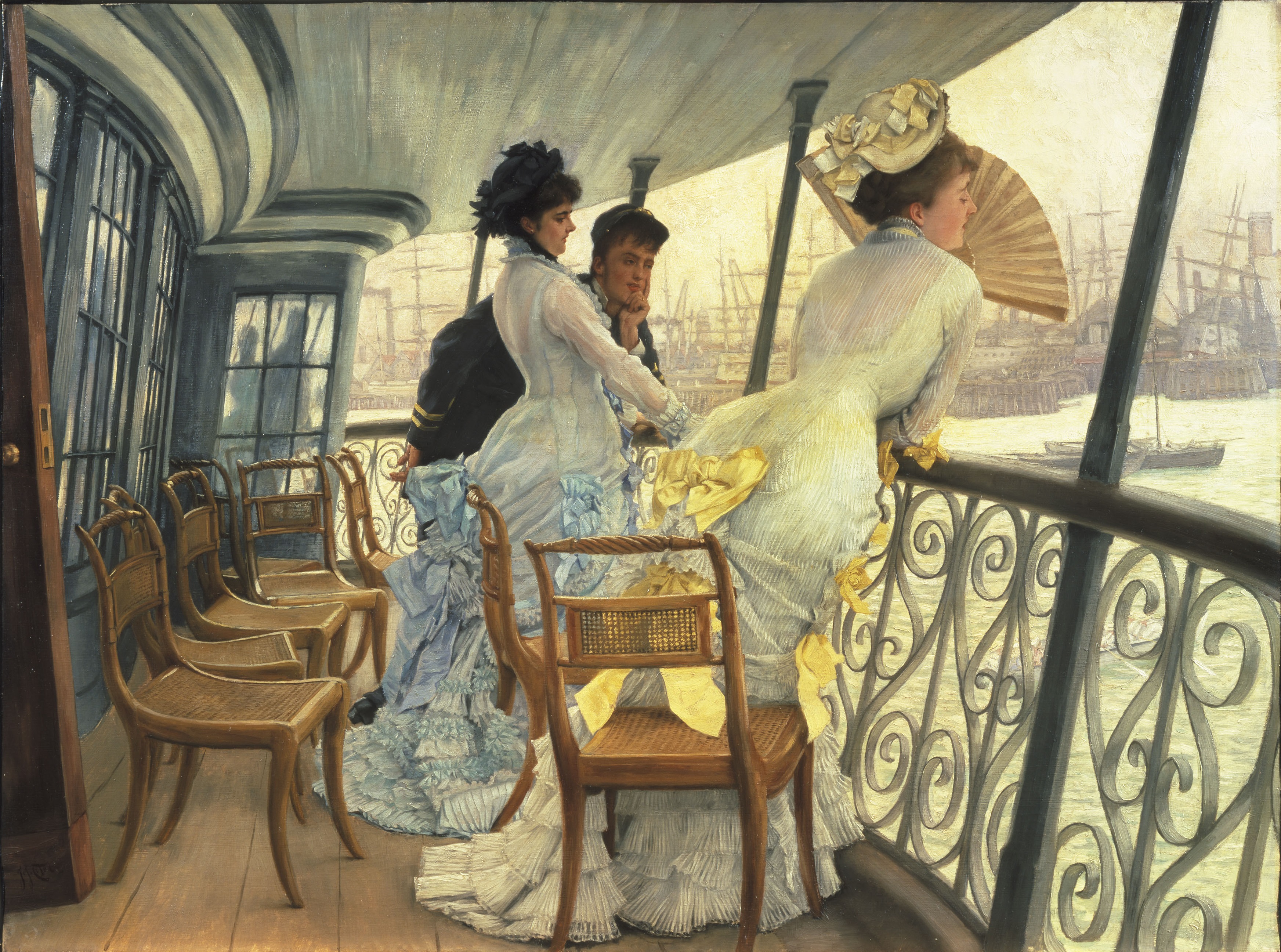Vite prisé par la bonne société victorienne, qui lui assure commandes et revenus, Tissot raille aussi subtilement ses travers et devient, selon l’expression d’Edmond de Goncourt, “l’ingénieux explorateur de la bêtise anglaise”. Superficialité, trivialité et même lubricité ne sont ainsi jamais tout à fait absentes des scènes qu’il s’applique à dépeindre dans l’esprit des narrative paintings, genre alors très en vogue. Le titre mystérieux de La Galerie du H.M.S. Calcutta (Portsmouth) (vers 1876) renverrait ainsi à l’expression française “quel cul t’as”, qu’on imagine volontiers dans la bouche du marin émoustillé par la pause de la femme à l’éventail. Est-elle véritablement gênée lorsqu’elle cache en souriant son visage, faussement prude, assurément provocante ? Pour Tissot il s’agit moins de dénoncer que de raconter une histoire dont nous ne connaissons ni le début ni la fin mais dont nous saisissons seulement un instantané magnifié par la beauté de l’exécution, le rendu naturaliste des robes, des étoffes, et de la rambarde du bateau formant une courbe suspendue au-dessus de l’eau.