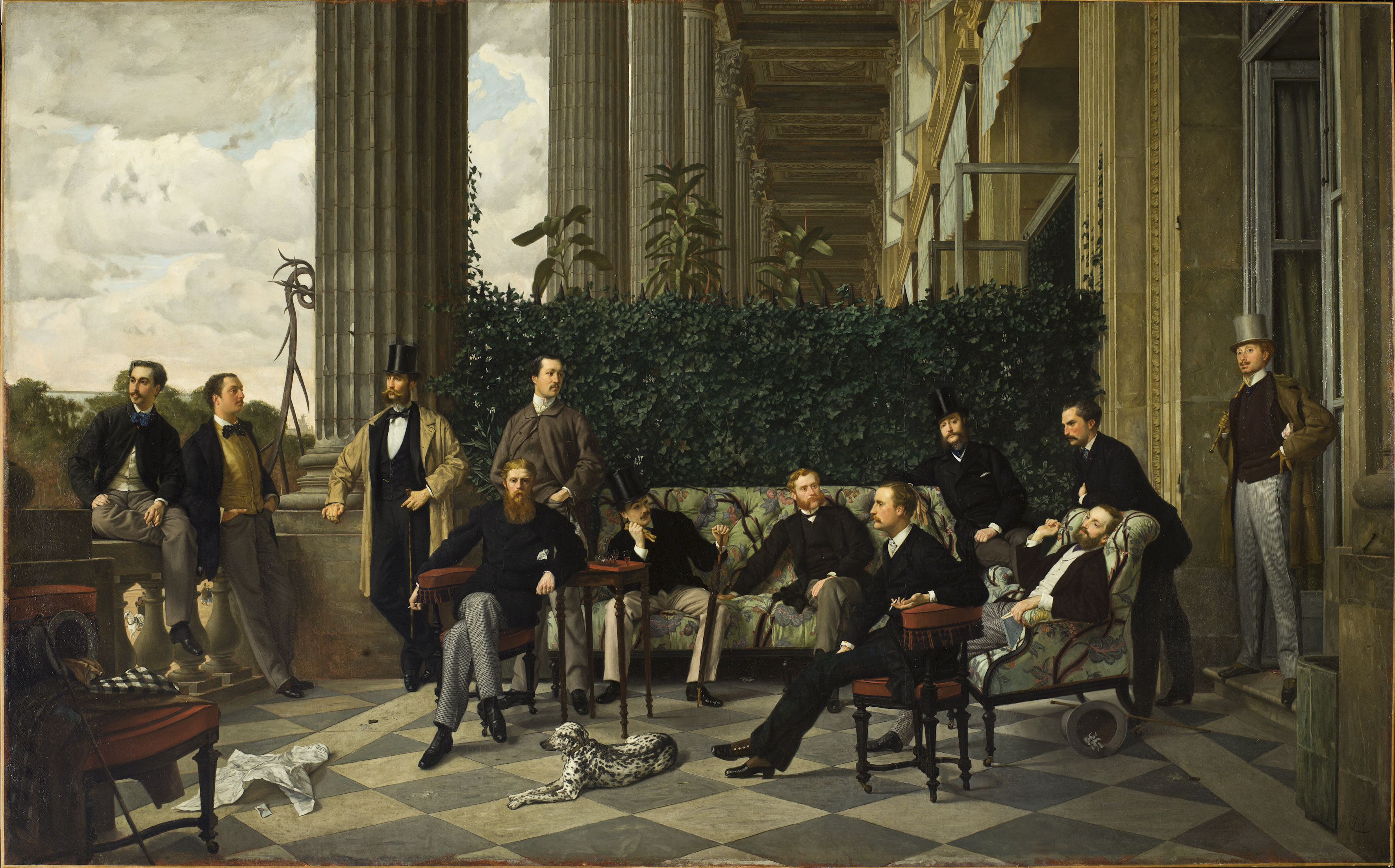 Peintre en vue de la haute société du second Empire, Tissot, qui a déjà voyagé à plusieurs reprises en Angleterre, s’inspire du genre typiquement britannique de la conversation peace pour représenter la classe dirigeante française. Ses portraits de groupe prennent place à l’extérieur dans un décor mêlant nature et élément d’architecture néo-classique, ainsi en 1865 dans le Portrait du marquis et de la marquise de Miramon et de leurs enfants et en 1868 dans Le cercle de la rue royale, réunissant l’élite financière et aristocratique du temps. Commandé collectivement par douze de ses membres, le tableau révèle notamment à l’extrême-droite le visage de Charles Haas, modèle explicite du personnage de Charles Swann dans La Recherche : “... cher Charles Swann, que j’ai si peu connu quand j’étais encore si jeune et vous près du tombeau, c’est déjà parce que celui que vous deviez considérer comme un petit imbécile a fait de vous le héros de ses romans, qu’on recommence à parler de vous et que peut-être vous vivrez. Si dans le balcon du Cercle de la rue Royale, où vous êtes entre Galliffet, Edmond de Polignac et Saint-Maurice, on parle tant de vous, c’est parce qu’on voir qu’il y a quelque traits de vous dans le personnage de Swann.” (Marcel Proust, La Prisonnière).