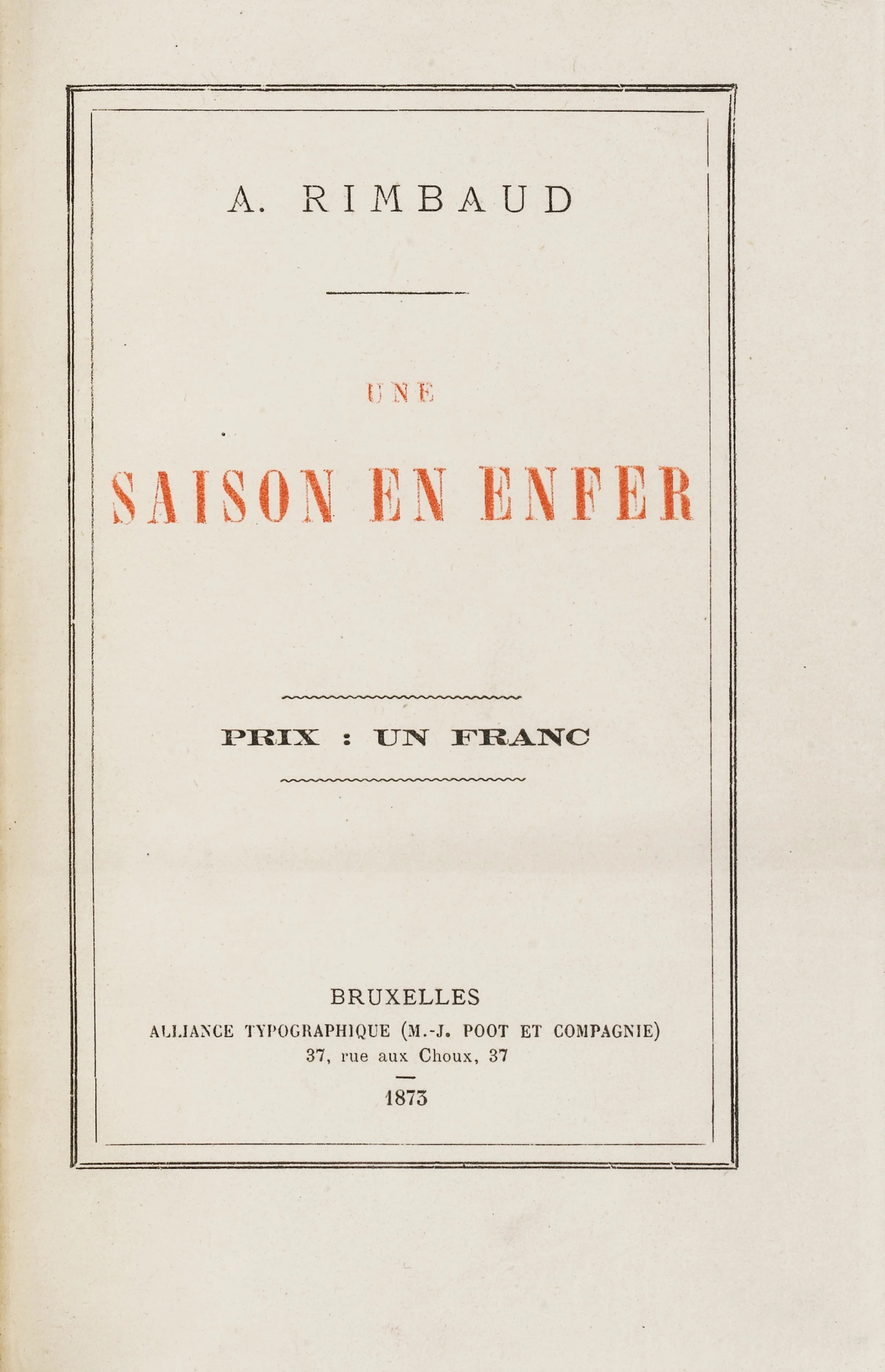 Des trois livres parus de son vivant, Rimbaud n'en conçut qu'un : Une saison en enfer. Les Illuminations furent publiées par Verlaine en 1886 et Reliquaire a été mis en œuvre par Rodolphe Darzens en 1891.Éditée à Bruxelles en 1873, Une saison en enfer a été tirée à 500 exemplaires à compte d'auteur – à compte de mère d'auteur, pour tout dire, car M me Rimbaud avait réglé l'avance réclamée par l'imprimeur. L'Alliance typographique, une association ouvrière, commence l'impression au mois de septembre. Dès octobre, Rimbaud se rend à Bruxelles, reçoit une poignée d'exemplaires d'auteur et rentre sans tarder à Paris. Il distribue la glane à ses proches – dont un exemplaire qu'il dépose à la porte de la prison où Verlaine est enfermé – puis il paraît se désintéresser du destin du livre. Les cinq cents volumes fraîchement brochés furent abandonnés chez l'imprimeur. Une saison en enfer « sombra corps et biens dans un oubli monstrueux », se désolera Verlaine. Le mythe du livre détruit par son auteur pouvait prospérer. En 1907, Stefan Zweig colportait encore la légende d'un Rimbaud qui avait fait imprimer le volume « pour en détruire les exemplaires dès le lendemain ». Il ajoutait : « Il n'en reste que trois ou quatre volumes, de minuscules petits cahiers graisseux, tirés sur du papier d'affinage, que le hasard a conservés. »