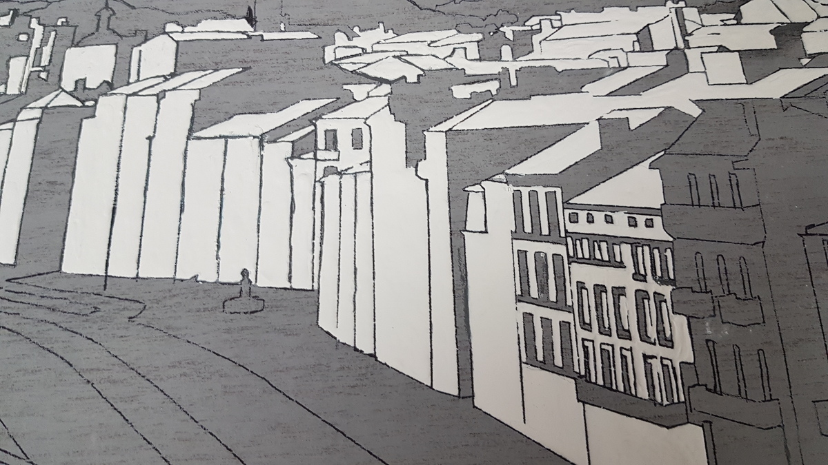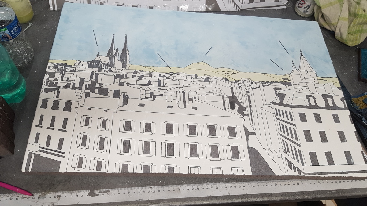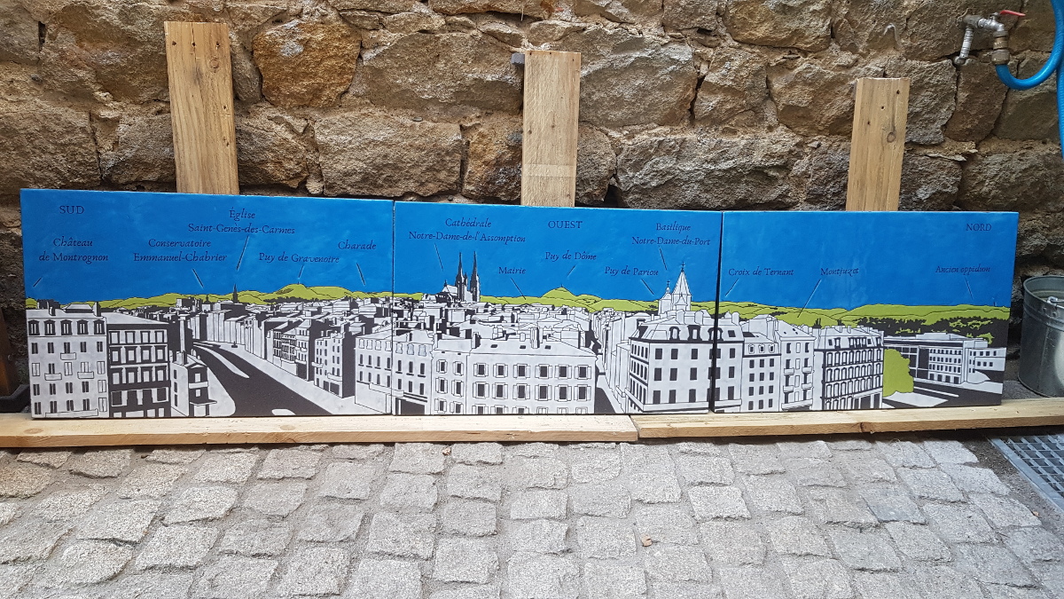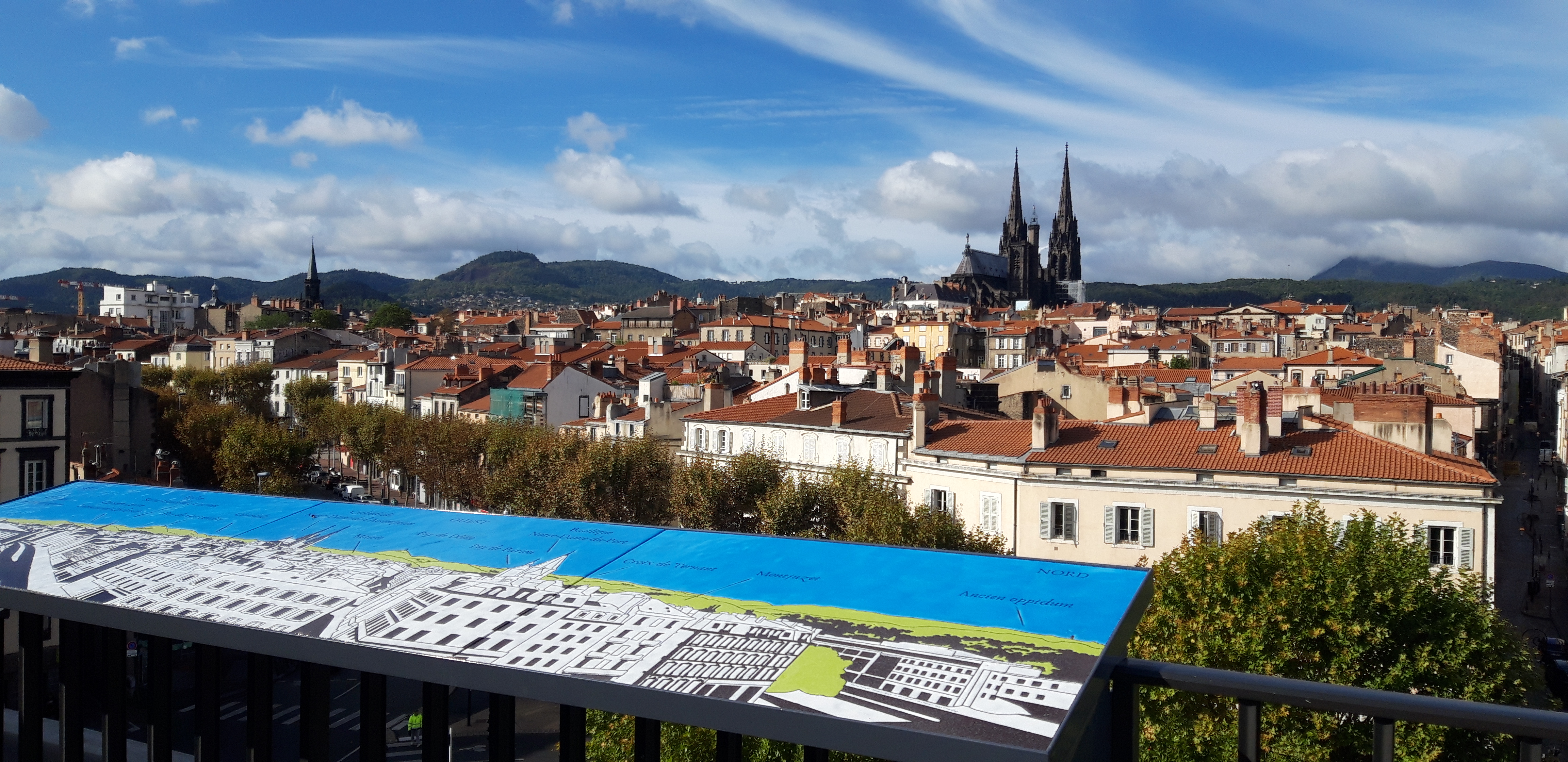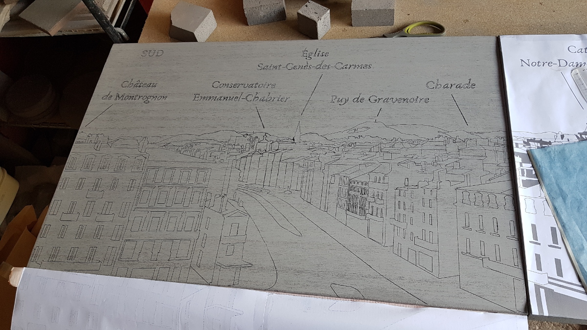 HL. Comment avez-vous conçu l'idée d'une table d'orientation sur la terrasse de l'hôtel Vialatte à Clermont qui offre un panorama à 180° sur les toits de la ville et la chaine des puys ? Pouvez-vous nous détailler les différentes étapes du travail de fabrication ?