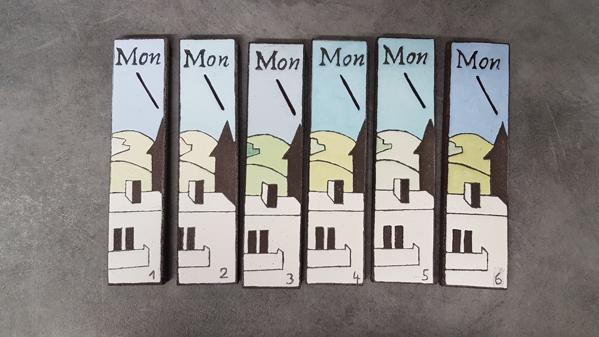 Ensuite je me suis occupée du dessin avec deux versions du même dessin utilisant deux gammes de couleurs différentes, le bleu & vert en l'occurence qui avait choisi pour l'hôtel. Il faut savoir qu'avant et après la cuisson, le rendu est très différent sur la pierre de lave. Il suffit de regarder les nuanciers pour s'en rendre compte :