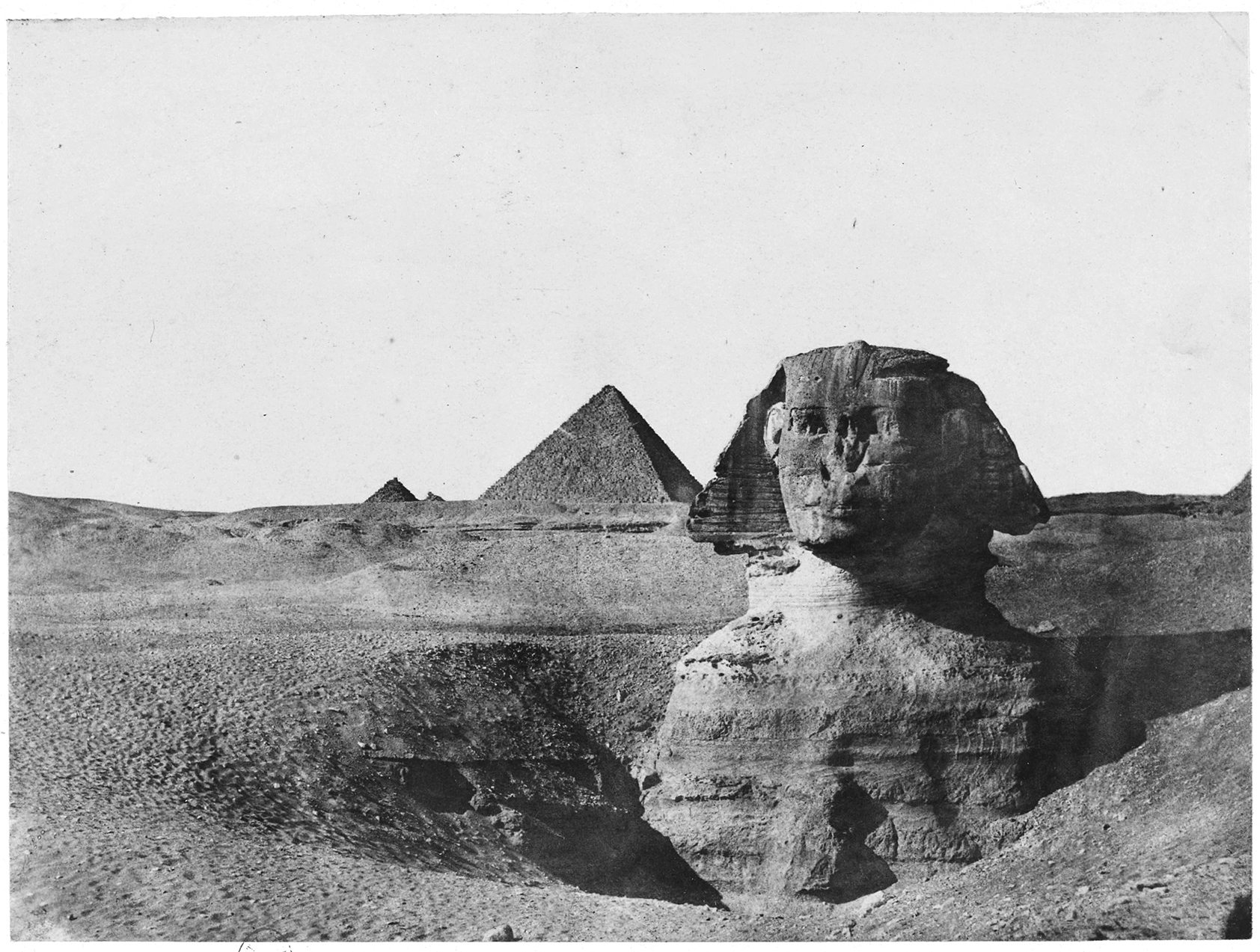 « Nous sommes arrivés au bas de la colline où se trouvent les Pyramides, il y a aujourd’hui huit jours (vendredi), à 4 heures du soir. C’est là que commence le désert. Ç’a été plus fort que moi, j’ai lancé mon cheval à fond de train, Maxime m’a imité, et je suis arrivé au pied du Sphinx. En voyant cela (qui est indescriptible, il faudrait 10 pages, et quelles pages !), la tête m’a un moment tourné, et mon compagnon était blanc comme le papier sur lequel j’écris. Au coucher du soleil, le Sphinx et les trois Pyramides toutes roses semblaient noyés dans la lumière ; le vieux monstre nous regardait d’un air terrifiant et immobile. Jamais je n’oublierai cette singulière impression. »