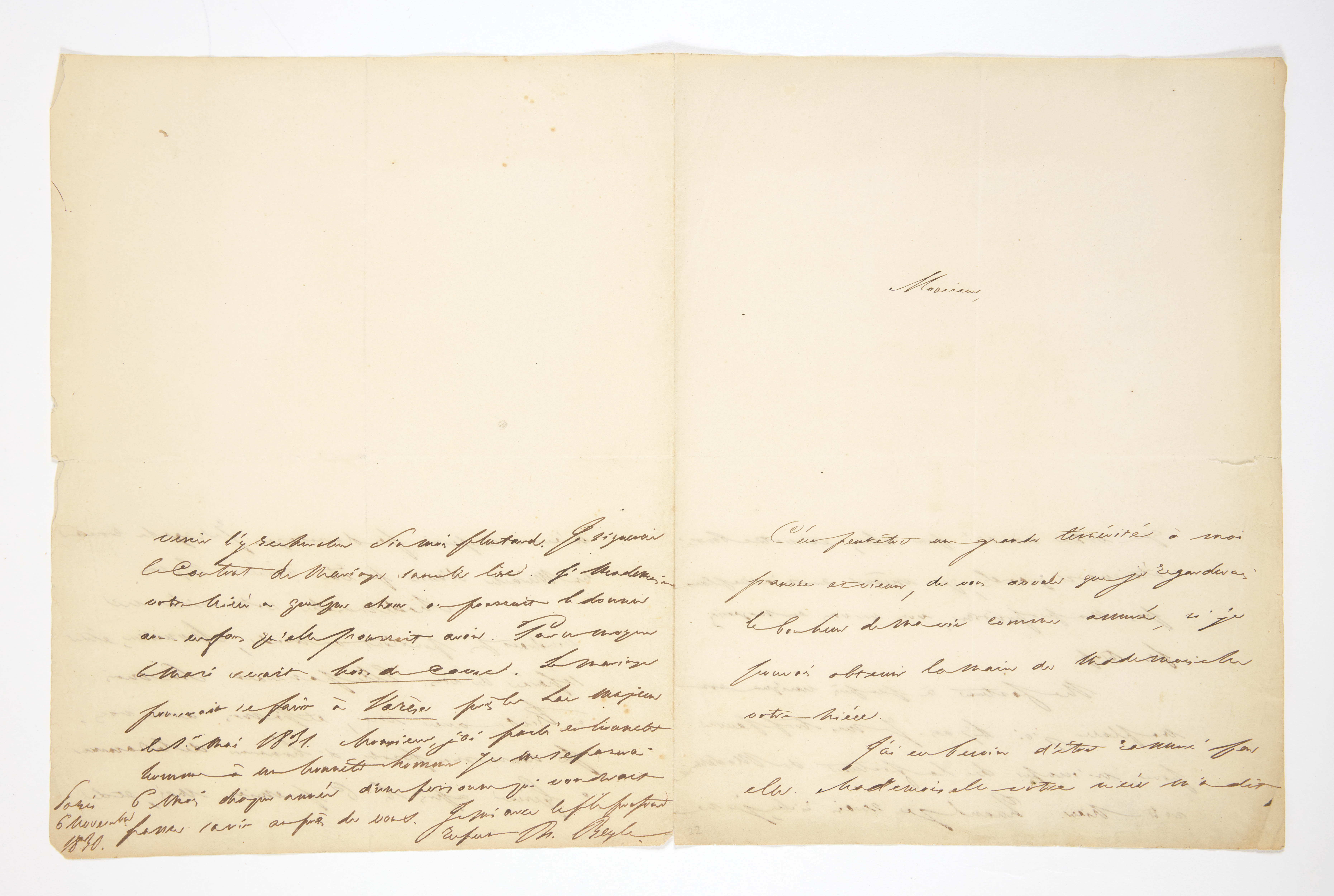Le 6 novembre 1830, au moment de quitter Paris pour Trieste, Stendhal se décide à une des plus grandes initiatives de sa vie : sa seule et unique lettre de demande en mariage.