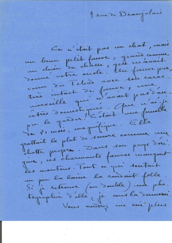 « Ce n'était pas un chat, mais un beau petit fauve, grand, comme un chien de chasse, que m'avait donné votre oncle. Un fauve pur, venu du Tchad, avec son caractère intact de fauve, une merveille qui n'avait pas d'ancêtres domestiqués. Que n'ai-je pu le garder. C'était une femelle de 21 mois, magnifique, elle grattait le plat de sciure comme une chatte propre. Dans son pays d'origine, ces charmants fauves mangent les moutons, tout ce qui sentait un peu la laine, la rend folle... »