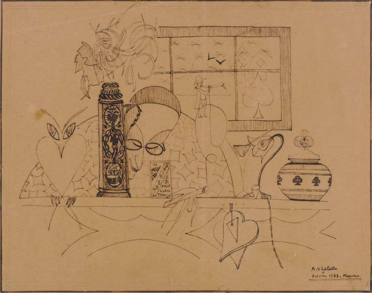L’exposition présente un intéressant autoportrait de Vialatte à l’encre de Chine, daté de 1923 lors de son séjour à Mayence, le représentant à son bureau, la cigarette à la main.