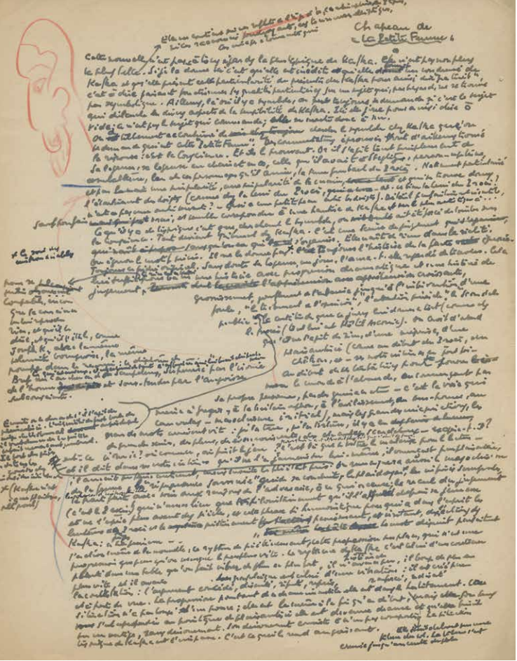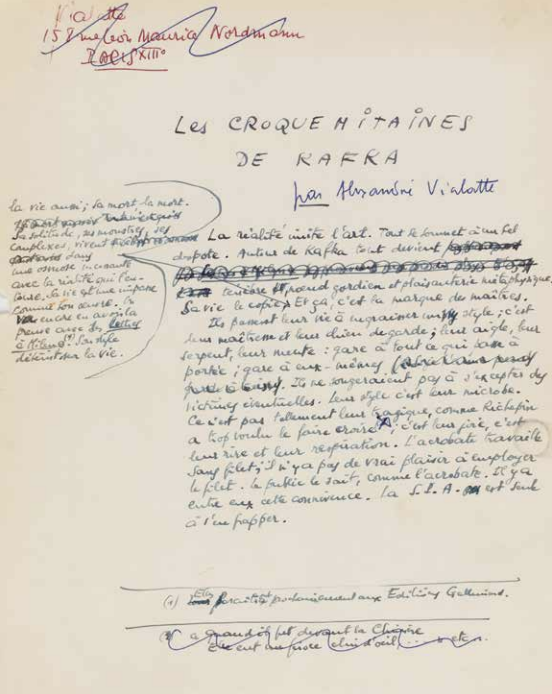 On trouve encore les « Interprétations de Kafka », manuscrit autographe de notes relatives à divers récits de Kafka ou à des thèmes présents dans son œuvre. « La Morale du Procès », manuscrit préparatoire de ce texte important à propos du Procès de Kafka. « Les Croquemitaines de Kafka », manuscrit autographe de ce très beau texte relatif à Kafka et l’intrication entre sa vie et son œuvre :