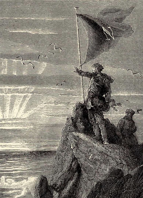 Le Capitaine Nemo hisse son drapeau personnel (un « N » argenté sur un fond couleur sable) sur le pôle Sud.