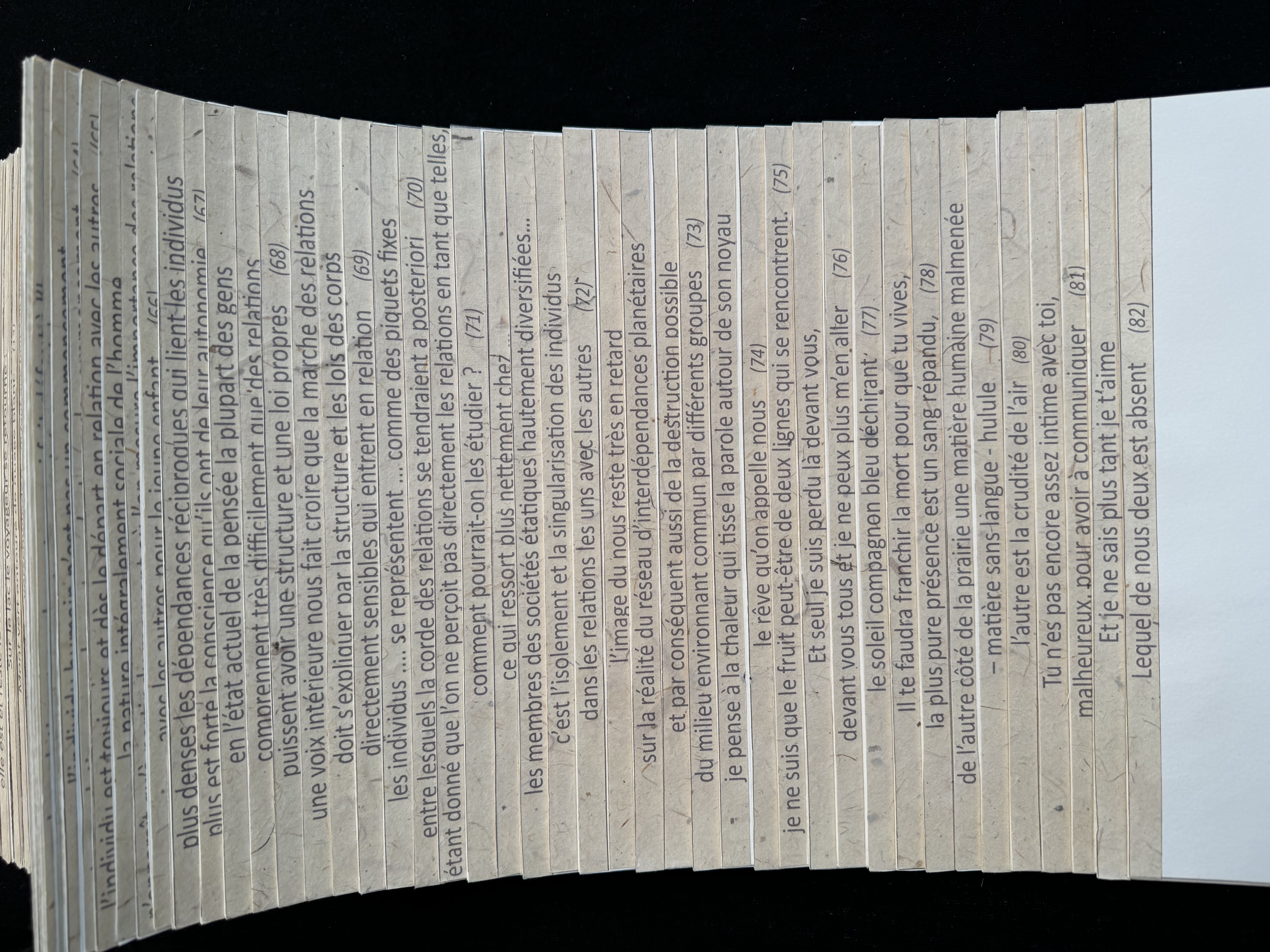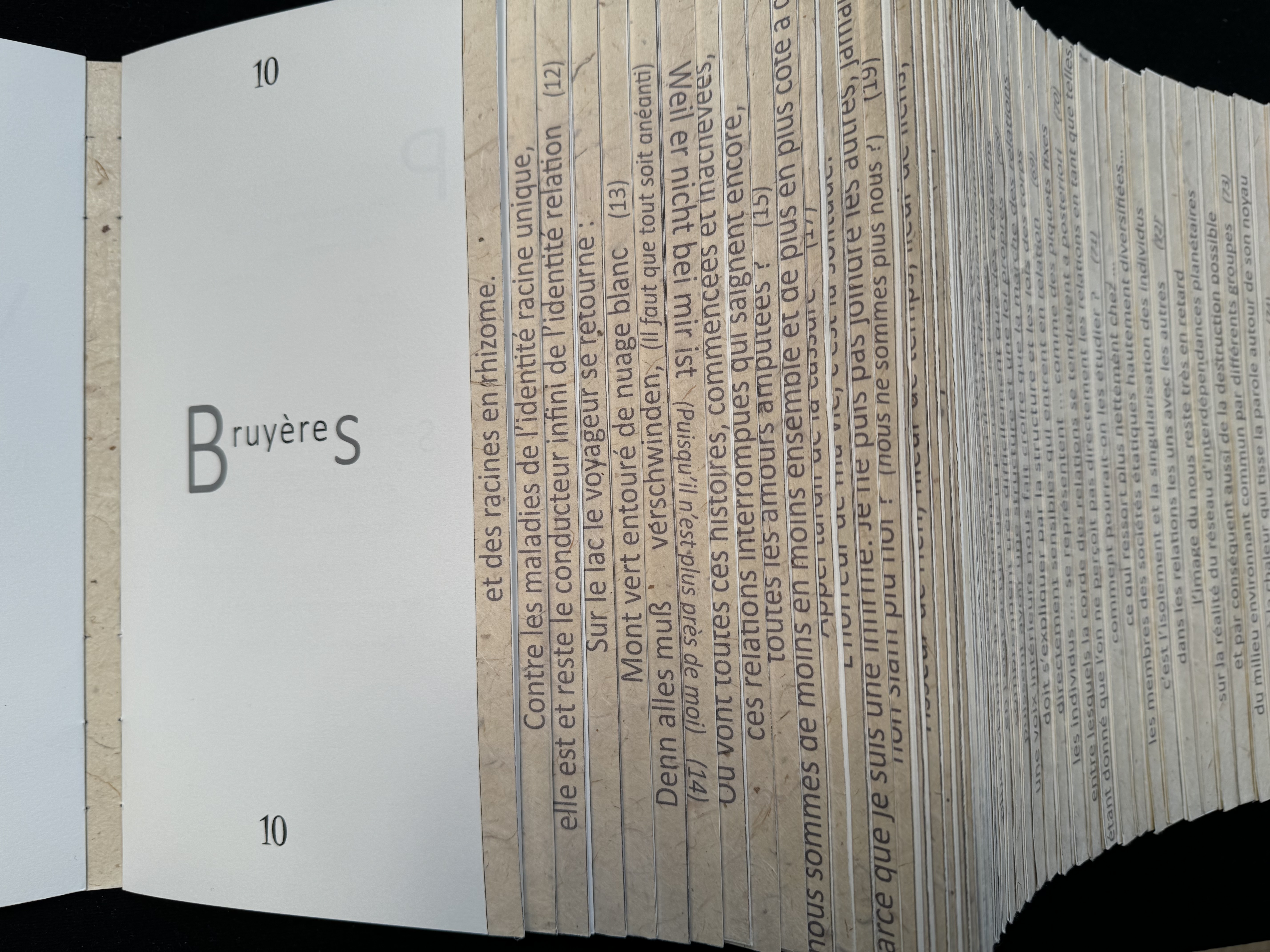 « Dans les gravures sur bois de pleine page en noir et blanc l’artiste décline, à travers ses lignes subtiles, toutes les nuances de noir en lui insufflant une force magique. Les versos des bois imprimés sur papier japon, laissés visibles, apparaissent comme des reflets dans un miroir mystérieux.