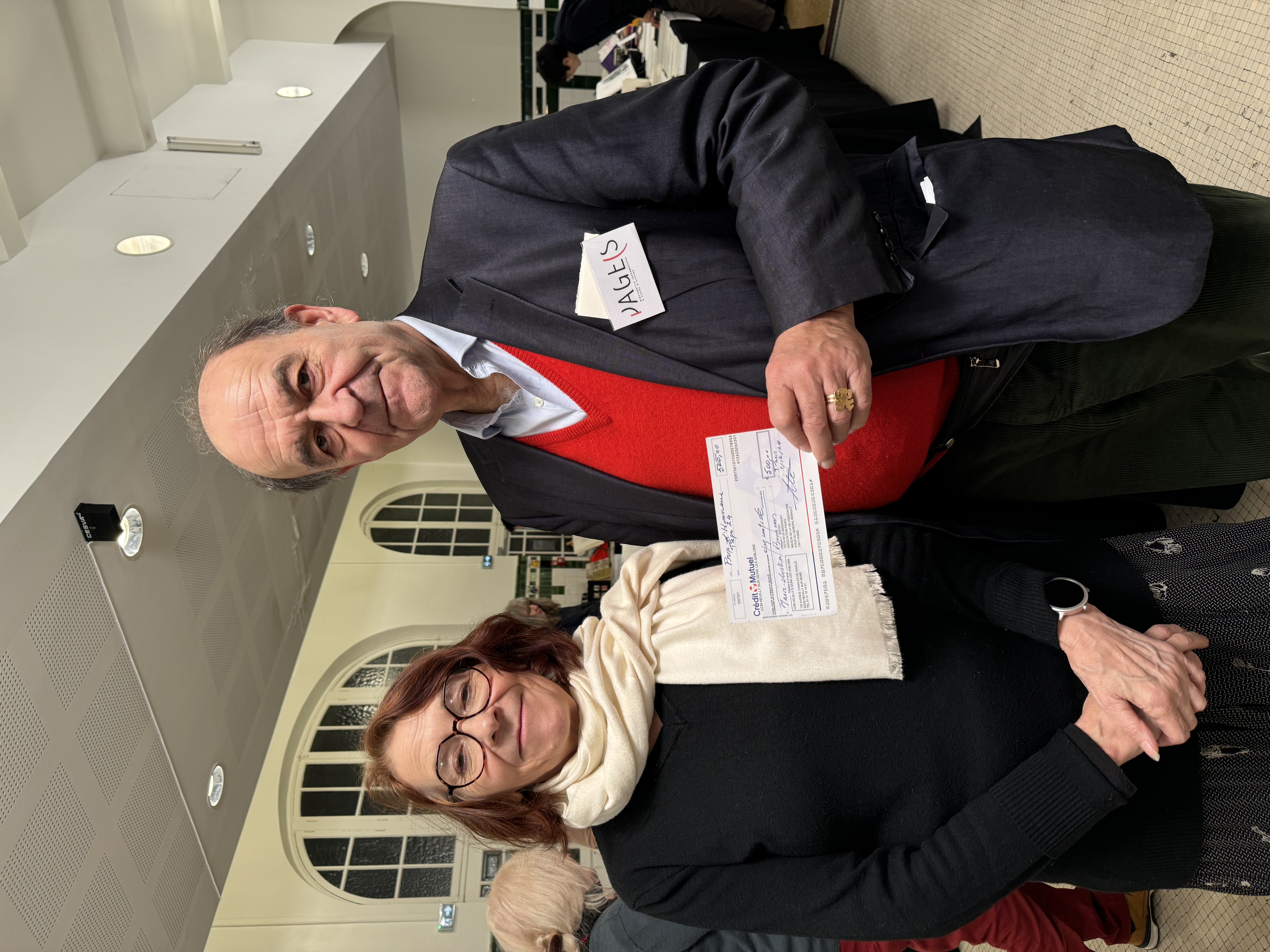 Le lauréat reçoit un chèque de 1.000 € et bénéficie d’une couverture médiatique aussi large que possible dans la presse spécialisée. Il en sera de même pour le lauréat du prix d’honneur, doté de 500 € par la Société des Hôtels Littéraires.Alain Gorius, trésorier de l'association Page(s, remet son prix à la lauréate du prix d'honneur 2024, Marie-Christine Bourven