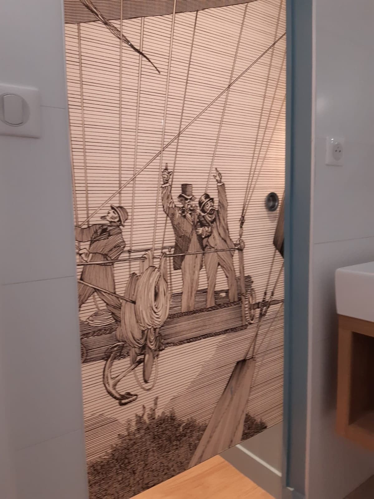 La vitrophanie de la salle de bain fait de nouveau référence à l’engin volant de Robur qui s’élève dans les airs pour faire découvrir son invention à deux voyageurs éberlués, devant le miroir aux allures d'un hublot du Nautilus de Vingt Mille lieues sous les mers.
