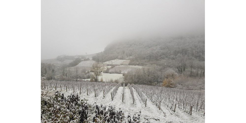 La neige dans le vignoble de Chateau Chalon. Photo Progres / Stéphane Cleau