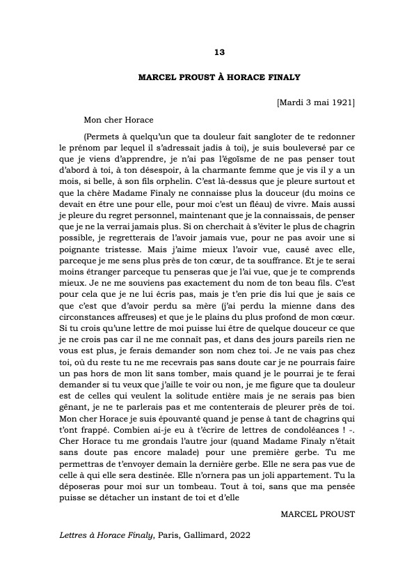 Ces Lettres inédites de Marcel Proust à Horace Finaly ont été publiées en juin 2022 aux Éditions Gallimard.