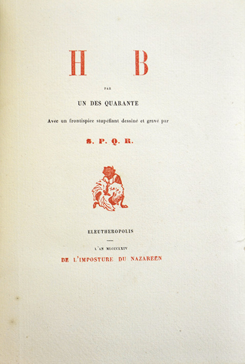 H.B. c’est donc Henri Beyle, et le titre du livre publié anonymement par Mérimée en octobre 1850, soit huit ans après la mort de Stendhal. L’édition originale de 1850 fut éditée à 25 exemplaires. Il s’agissait d’une mince plaquette de seize pages, in octavo, imprimée par Firmin Didot frères, 56 rue Jacob.
