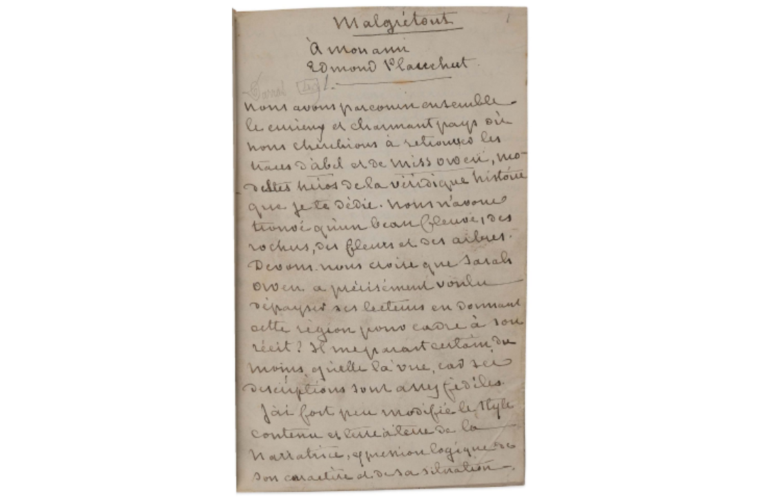 Outre une lettre inédite de Plauchut, la Société des Hôtels littéraires possède le manuscrit autographe de 979 pages de « Malgrétout » écrit par Sand en 1869. En septembre de cette année, Sand parcourut les Ardennes avec Plauchut auquel est dédié le livre, avec, dans le manuscrit comme dans le livre, une longue dédicace remerciant Plauchut de lui avoir fait découvrir la région où se déroule l’action.