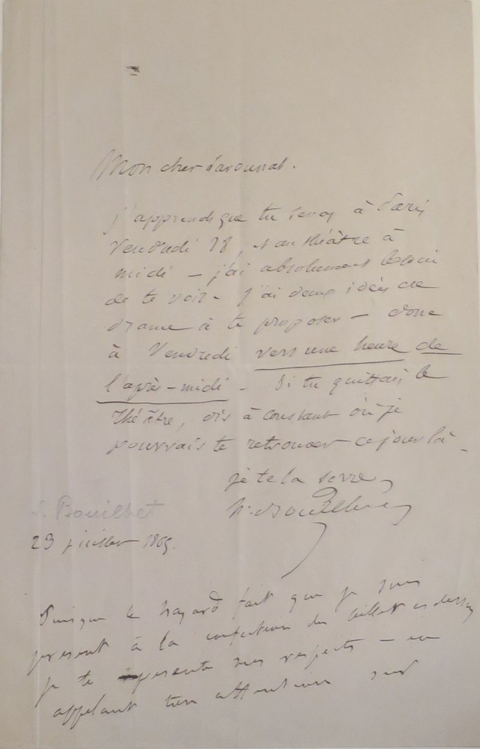 « 23 juillet 1865. / Puisque le hasard fait que je suis présent à la confection du billet ci-dessus, je te présente mes respects – en appelant ton attention sur le second plan de notre ami, lequel, malgré une coupe inusitée, me semble destiné à devenir qq chose de très beau – / Merde pr les plumes de fer. / je te serre la dextre. / Gve Flaubert ».
