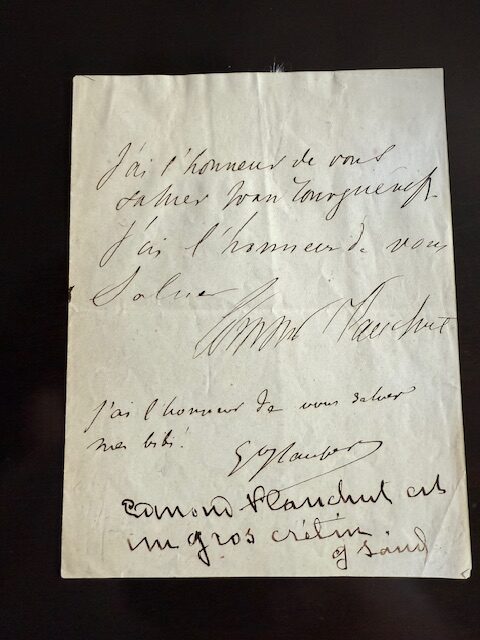 HL - Yvan Leclerc, selon vous, à qui était destiné ce billet et de quand peut-on le dater ?YL - La Société des Hôtels littéraires vient d’acquérir un document inédit, unique en son genre, et difficile à identifier. Il est revêtu de quatre signatures, dans l’ordre : Ivan Tourgueneff (le second « f » semble être resté dans la plume, mais il est habituellement présent à la fin de cette graphie de l’époque), Edmond Plauchut, Gve Flaubert et G Sand. Les trois premiers ont recopié le même énoncé : « J’ai l’honneur de vous saluer », Flaubert ajoutant un complément affectueux : « mon bibi ! ». Et George Sand, pour finir, s’est détachée du groupe en ne recopiant pas la formule pour la quatrième fois, mais en revenant d’une façon réflexive sur le texte lui-même par un jugement amusant qui vise le deuxième signataire : « Edmond Plauchut est un gros crétin. »