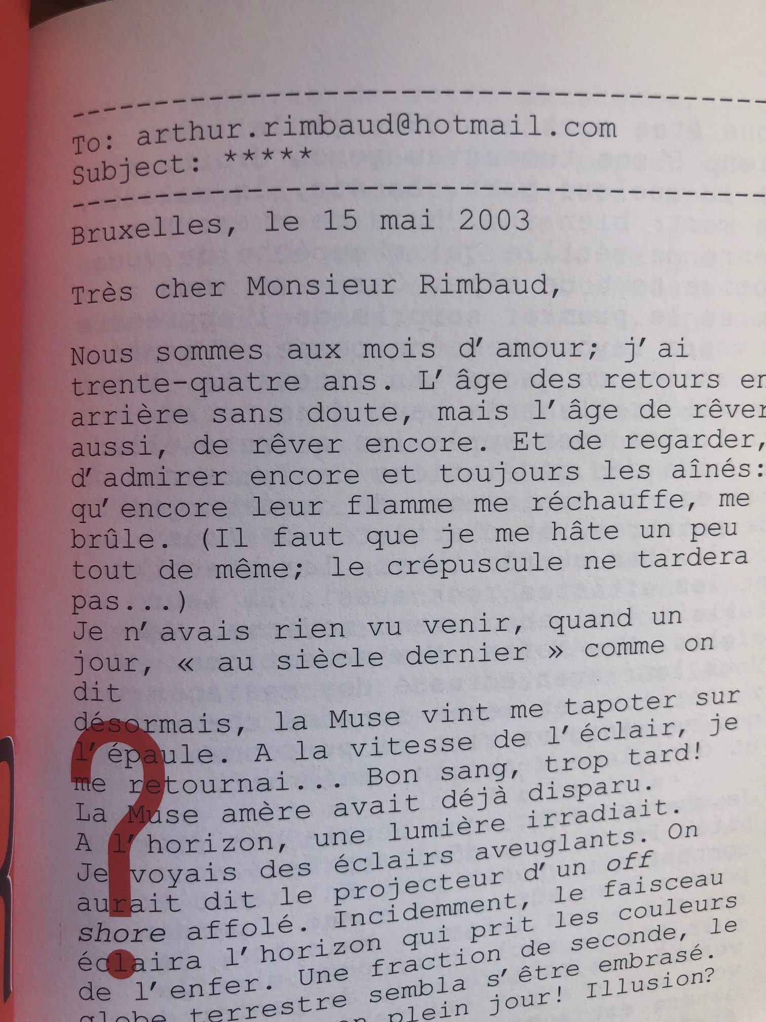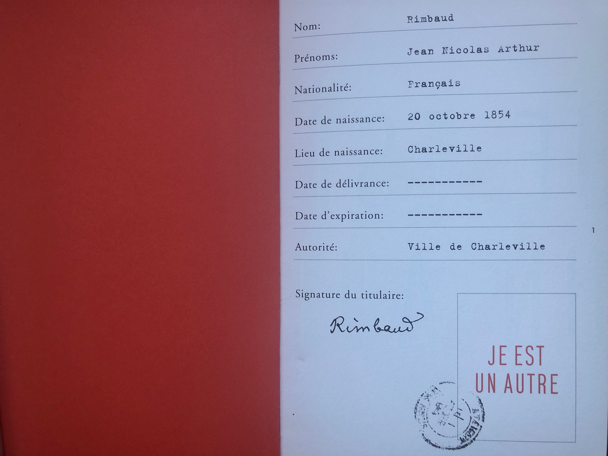 Il s’agit du passeport de Rimbaud, un faux bien sûr, puisqu'il s'agit en réalité de la version aussi originale que réussie du catalogue de l’exposition consacrée à Arthur Rimbaud (1854-1891). Une Saison en enfer au Palais des Beaux-Arts de Bruxelles en 2004.