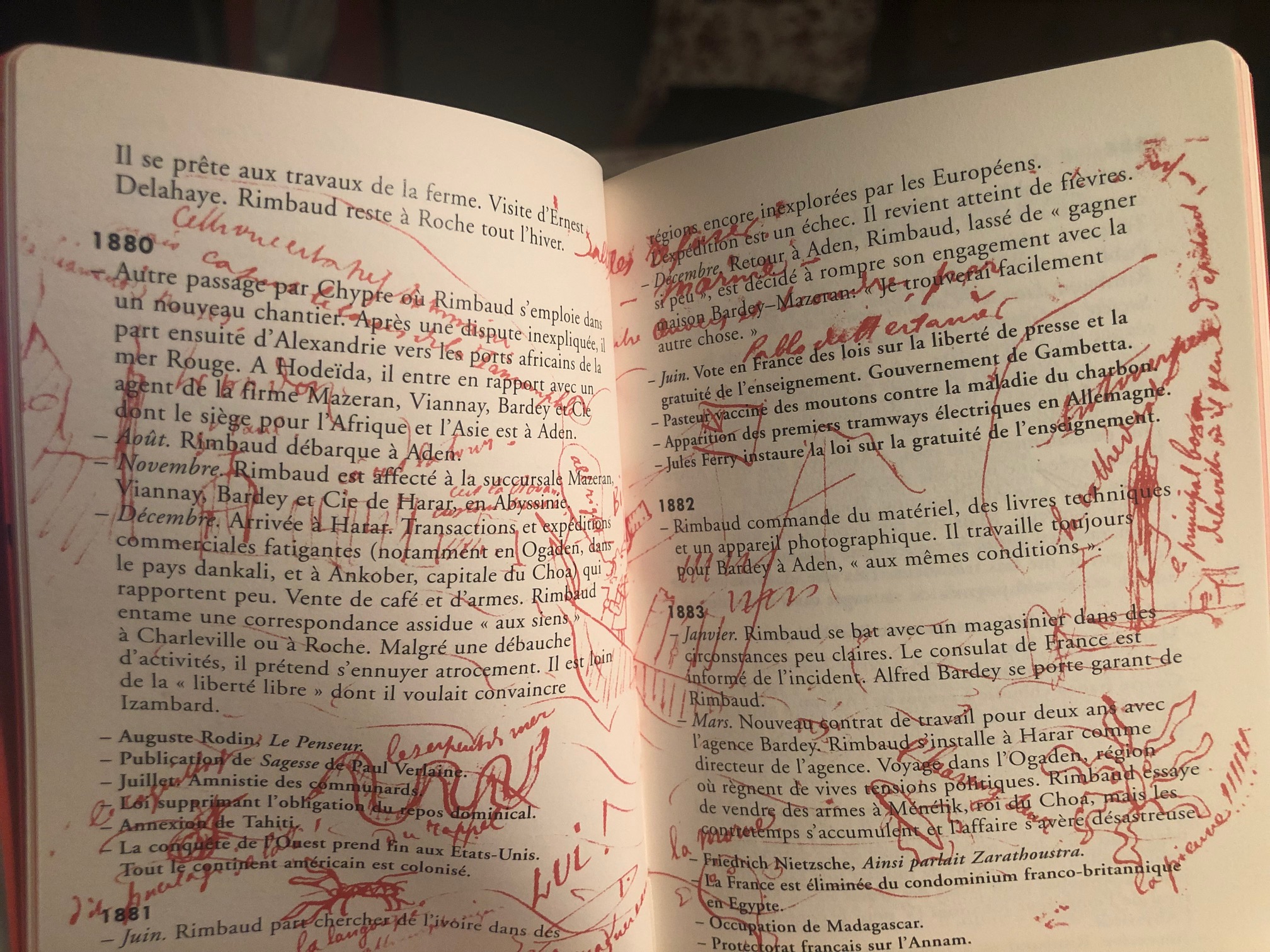 On y trouve d'abord une chronologie établie par Bernard Bousmanne et Franz De Haes, qui propose une vision très complète des événements principaux de la vie de Rimbaud et de celle de Verlaine, en intégrant le contexte politique, militaire, économique et culturel de l’époque. Des dessins, citations et caricatures de Rimbaud, Verlaine et Ernest Delahaye sont apposés sur les textes tels des tampons indiquant les destinations de ses voyages.