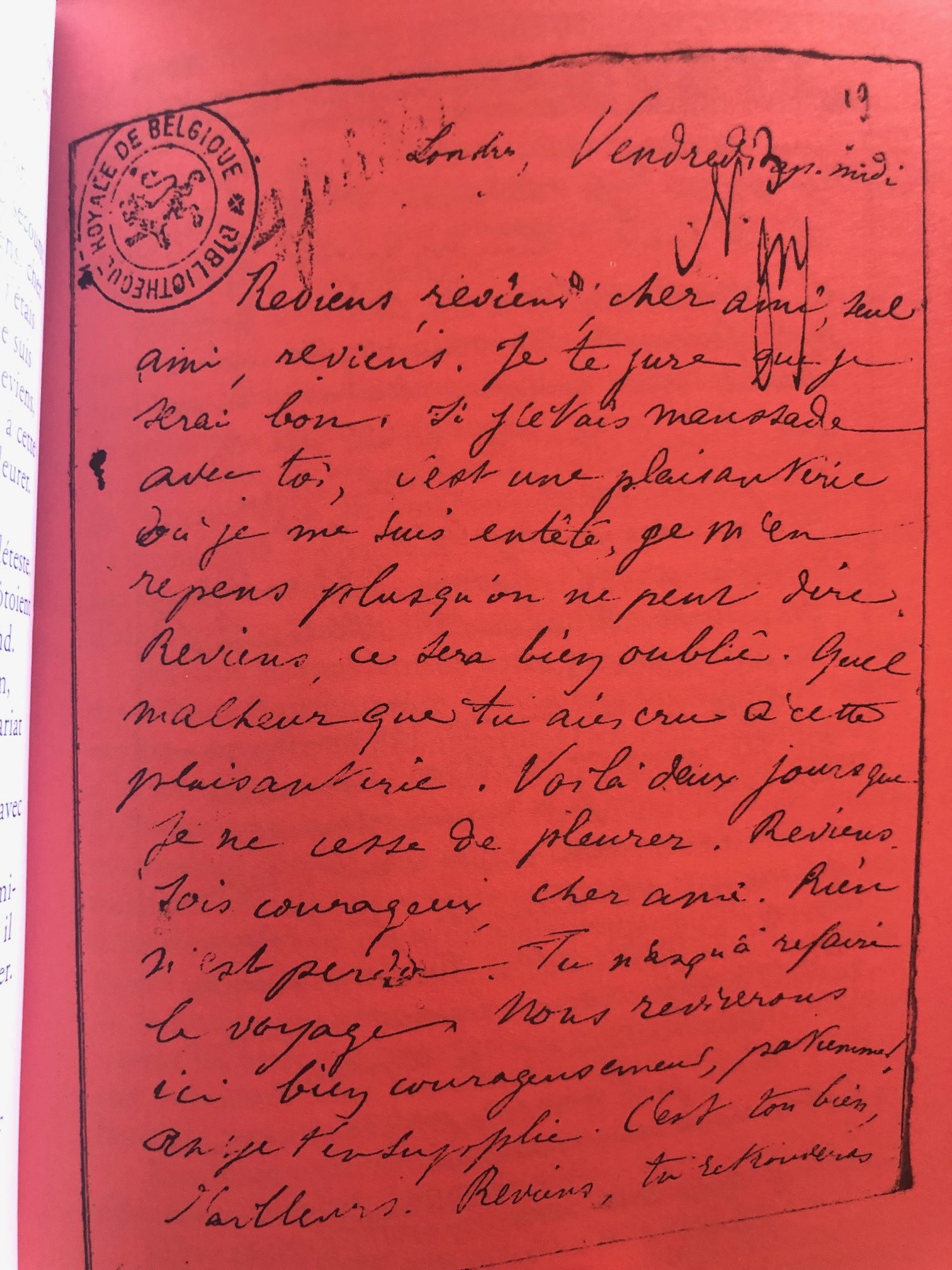« Reviens, reviens, cher ami, seul ami, reviens. Je te jure que je serai bon. Si j’étais maussade avec toi, c’est une plaisanterie où je me suis entêté, je m’en repens plus qu’on ne peut dire. Reviens, ce sera bien oublié. Quel malheur que tu aies cru à cette plaisanterie. Voilà deux jours que je ne cesse de pleurer. Reviens...»