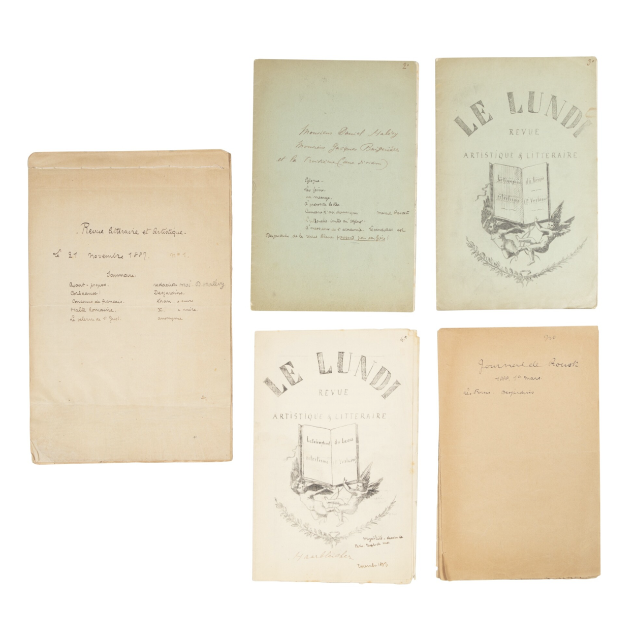 Nous connaissons cinq numéros du Lundi. Revue littéraire & artistique, publiés entre novembre 1887 et mars 1888. D’autres livraisons ont pu exister. Daniel Halévy, en classe de troisième, et Marcel Proust, en classe de rhétorique, dirigent la revue. Ces cahiers sont soit manuscrits soit imprimés de manière artisanale. La plupart des articles ne sont pas signés ou le sont de pseudonymes de potaches. La Revue de seconde succédera au Lundi à la rentrée scolaire suivante. Parmi les collaborateurs, Jacques Baignères, Abel Desjardins. Halévy, d’une famille attentive aux archives, a conservé cette collection.