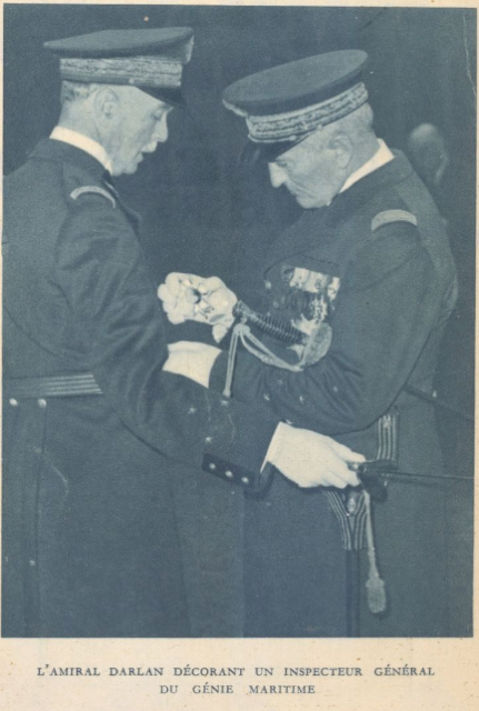 Le vice-amiral Darlan, chef d’état-major général de la Marine, lui remet la plaque de grand officier de la Légion d’honneur le 10 janvier 1939, lors d’une prise d’armes dans la grande cour du ministère, place de la Concorde.