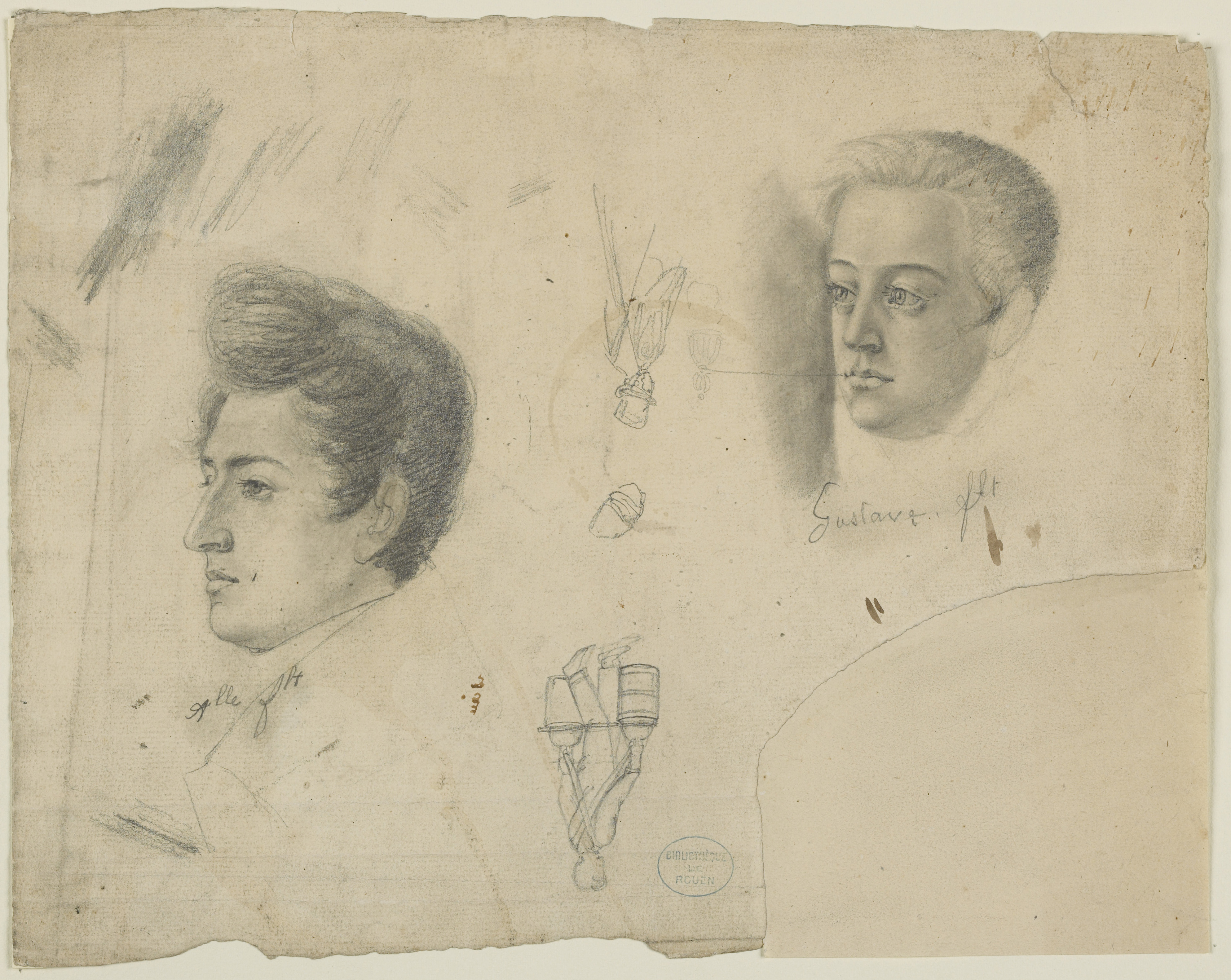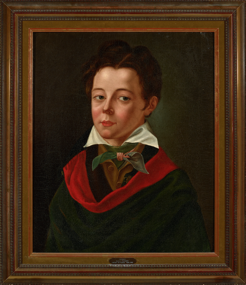 La tradition de faire représenter les visages aimés et familiers est en effet attestée de longue date chez les Flaubert qui fréquentaient à Rouen de nombreux artistes. Eustache-Hyacinthe Langlois, disciple de Jacques-Louis David, exécuta ainsi un dessin de Gustave vers l’âge de neuf ans. Une copie datée de 1920 et de la main de sa propre nièce Caroline est présentée dans l’exposition. On peut aussi y admirer un dessin sur le vif de Gustave et Achille, respectivement âgés de 14 et de 22 ans. Il fut réalisé en 1835 par Delaunay, lui-même élève de Langlois. Et c’est Achille en personne qui croqua vers 1830 à la mine de plomb son petit frère, le représentant en pied et de profil, bras croisés et cheveux ébouriffés. Daté de 1832-1833 enfin, un tableau anonyme dit “Gustave au ruban” fut peint à l’occasion d’une remise de prix du collège royal de Rouen.